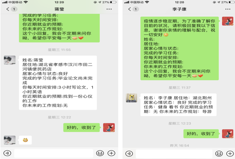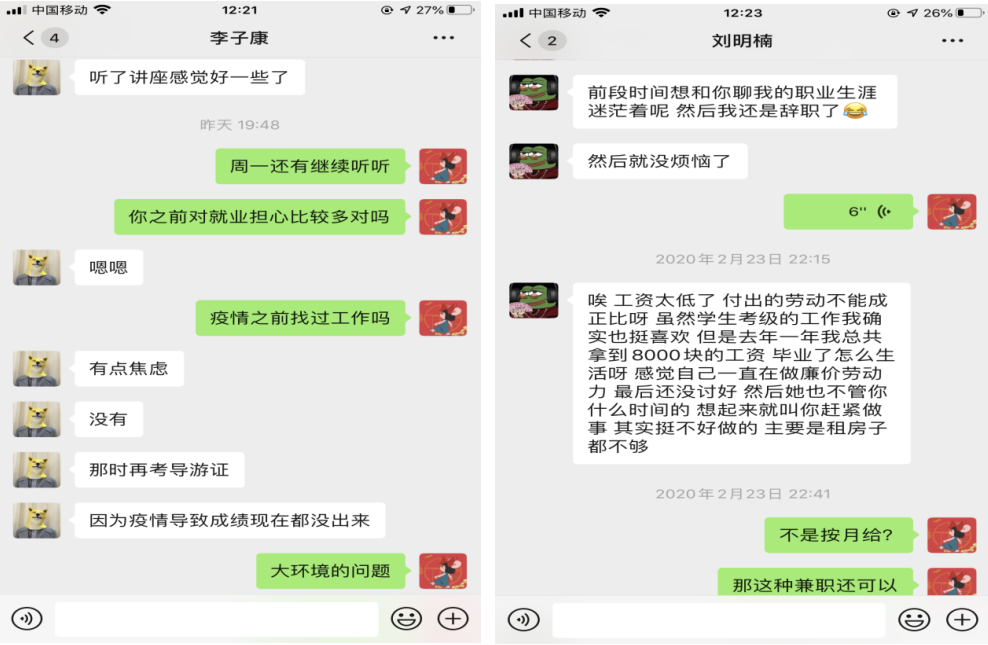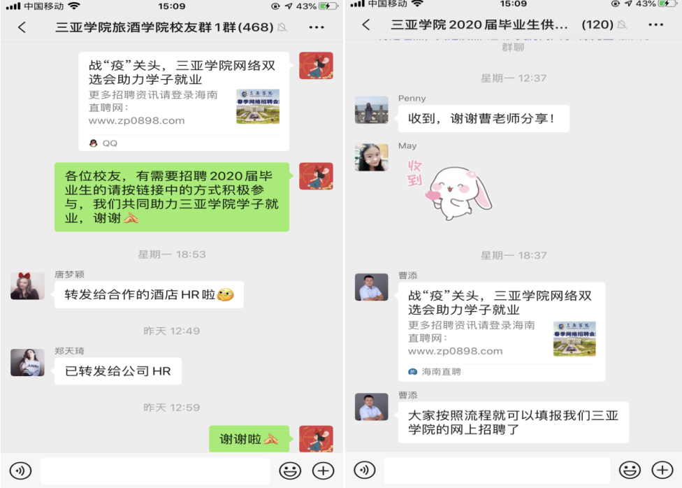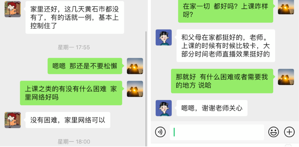 在毕业班班级的微信群发布温馨提示、转发防疫知识、开辟防疫推送及各类就业指导与招聘信息等,以不间断的“提醒”“督促”,传递来自公司与老师的关心关爱,让员工和家长多了一份安全感、踏实感同时及时了解线上招聘信息,毕业生们在有效筛选后结合个人情况侧重选择。我也不断地引导毕业生们主动在春招会中投递简历、参加视频面试,并提醒毕业生在线上就业签约时,谨防收费陷阱、试用期陷阱、推荐信陷阱、“高薪”岗位陷阱等形式的招聘陷阱;同时开展以小组形式展开不同主题的探讨与交流,让毕业生们多分享居家状态与就业途径,让每小组相互借鉴经验,促使毕业生整体就业率提升。