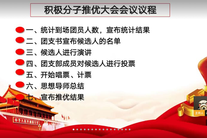 推优大会伊始,由团支书徐梦迪公布大会流程,并讲解推优标准及投票流程。13位团员分别打开软件的视频功能,每人都需要表达自身对入党动机和党的认识,限时三分钟。演讲结束后,团员开始投票,票数没有超过投票者二分之一的人则被淘汰。投票结束后,由思想导师刘文琦总结此次大会内容并表示希望员工们能够积极为班级、为公司做出贡献。