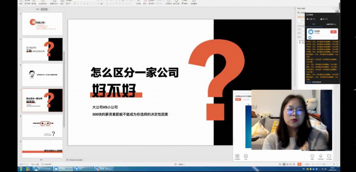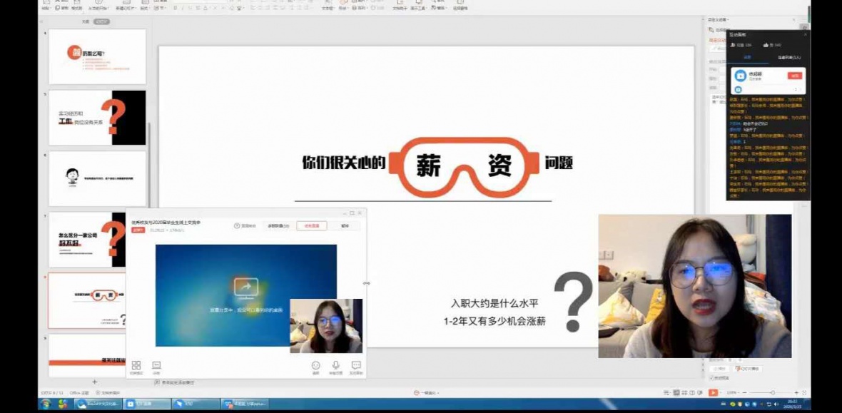 为公司2020届毕业生明确职业发展方向,提高求职面试技巧,3月25日晚8时,公司邀请了14级优秀员工练超颖在线上与公司员工分享求职经验分享,公司思想导师石玲老师组织线上交流会,2020届毕业生积极参会。