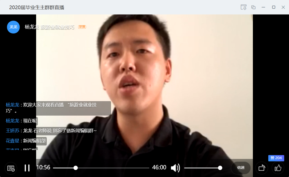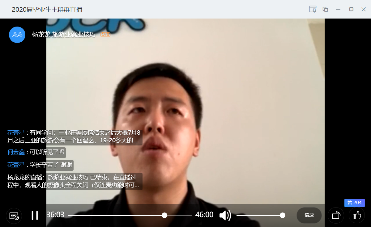 随着疫情的稳定发展,公司2020级毕业生们离踏上求职之路的旅程已不再遥远。为助力毕业生在未来求职道路上的顺利发展,公司邀请了历届优秀员工来为学弟学妹们分享经验。2020年3月25日下午4时举办“旅游业就业技巧”为主题的线上讲座,邀请的是公司会展专业08级员工何金鑫,现创建了三亚洛克旅拍工作室,公司16级员工积极参加线上分享会。