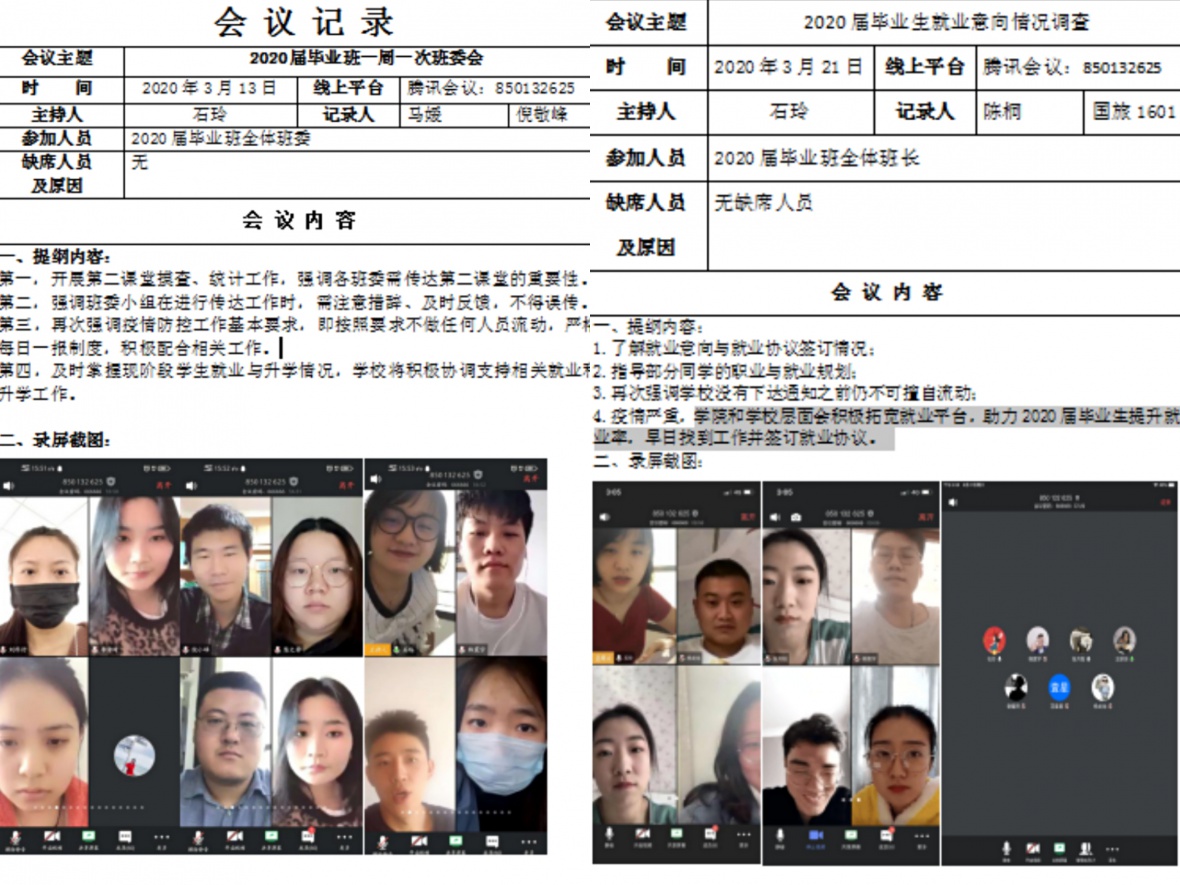 2020年3月13日、3月21日,公司毕业班思想导师石玲老师与曹添老师,通过线上平台腾讯会分别召开了两场班委会。班委会主要围绕着疫情防控纪律与员工就业实时情况而展开。