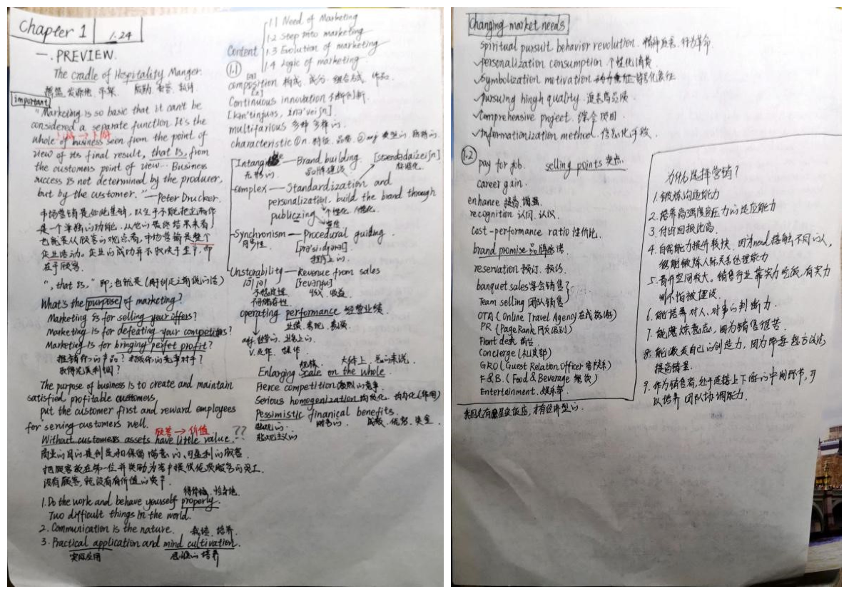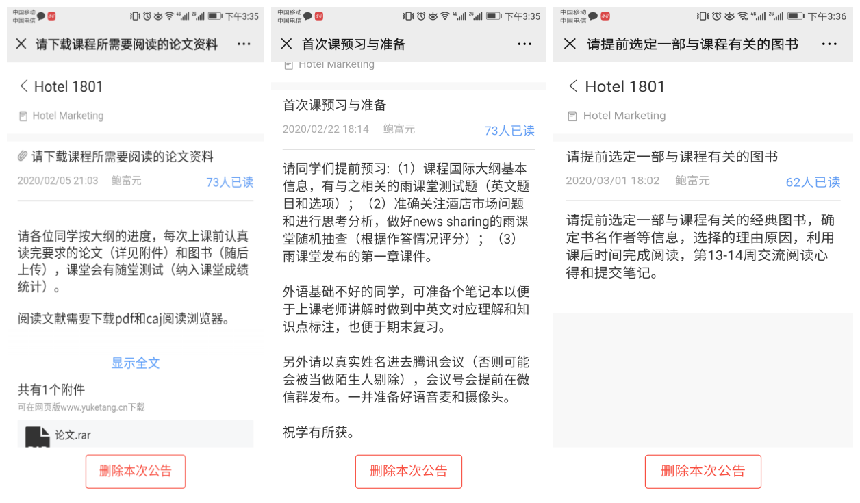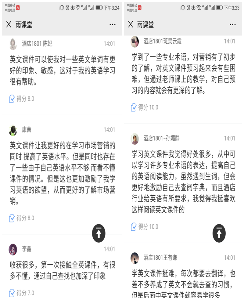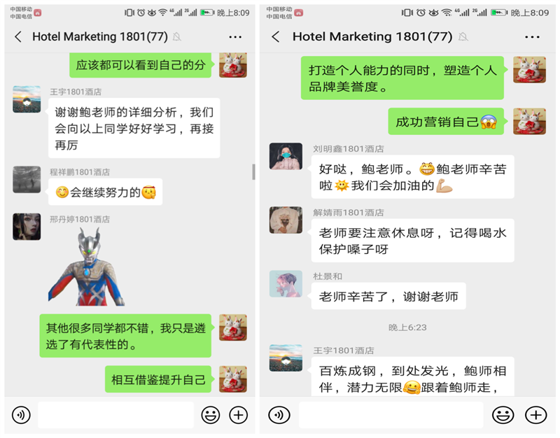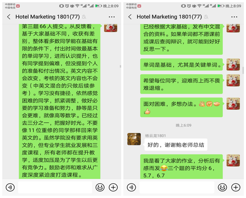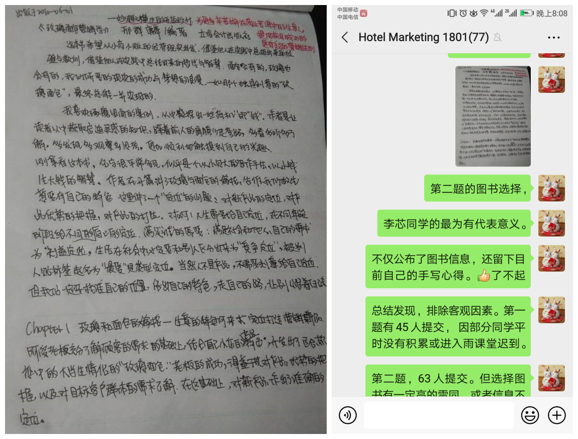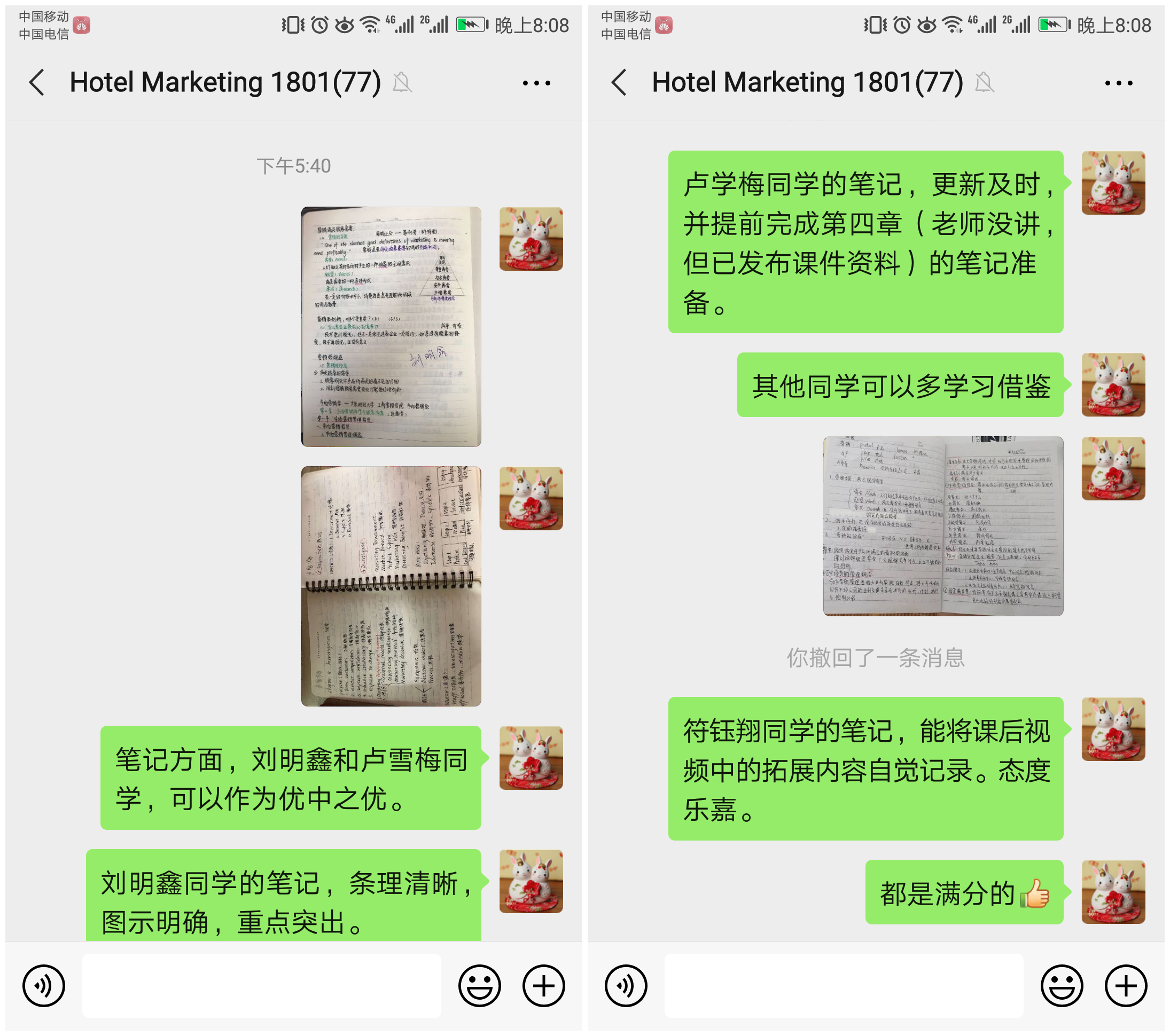 课程反思及调整。网络授课作为新形式,需要及时反思总结。首先,关注员工对课程内容的反馈并调整。为把握同学们对英文版教学内容的学习情况,鲍富元老师通过在线平台收集同学们对英文版教学资源的学习收获与感知,并通过在微信教学群加以分析总结和解答,帮助同学们树立信心;在发现对于部分英语学习基础偏弱且存在学习困难后,鲍富元老师在每章授课结束后,及时发布该章的中英配合版的教学课件,辅助他们开展针对的学习。其次,深化课程内容与行业的对接。除了教师的线上内容,还将本学期万礼豪程开放的嘉宾在线系列讲座吸纳入教学辅助资源,组织有时间的同学参与在线学习,针对与专业、课程有关的内容,鼓励同学们认真观看和思考嘉宾对行业发展动态的解读,并作为时事分享、课后作业等任务的重要参考,目前,已组织观看3周次,涉及职业人的正念、酒店收益管理、职场沟通,后续仍将有酒店企业高管的直播讲座。观看过程中,作为市场营销的后续延伸类课程,收益管理在同学们的头脑中有了初步的理解,帮助同学们明确营销管理的实践应用与管理高度。再次,及时给予课后作业、课堂参与等方面的肯定。在批阅员工的小组作业或个人作业后,选取优秀的为同学们做展示,说明优秀作业的标准和创新点,既肯定他们的优点,也帮助其他小组认识到自己作业的不足,鼓励更多同学们努力认真按要求提交高质量的课后作业。