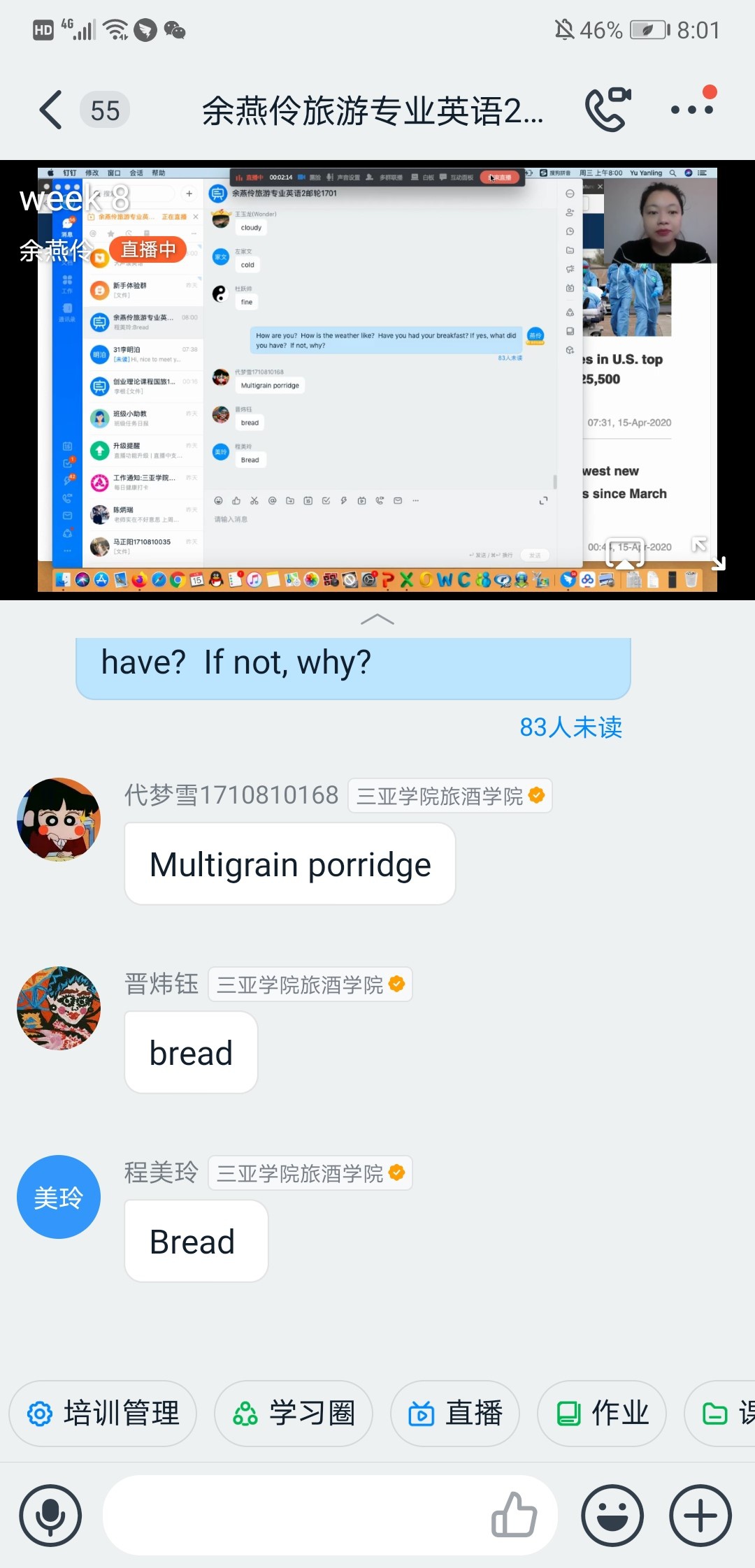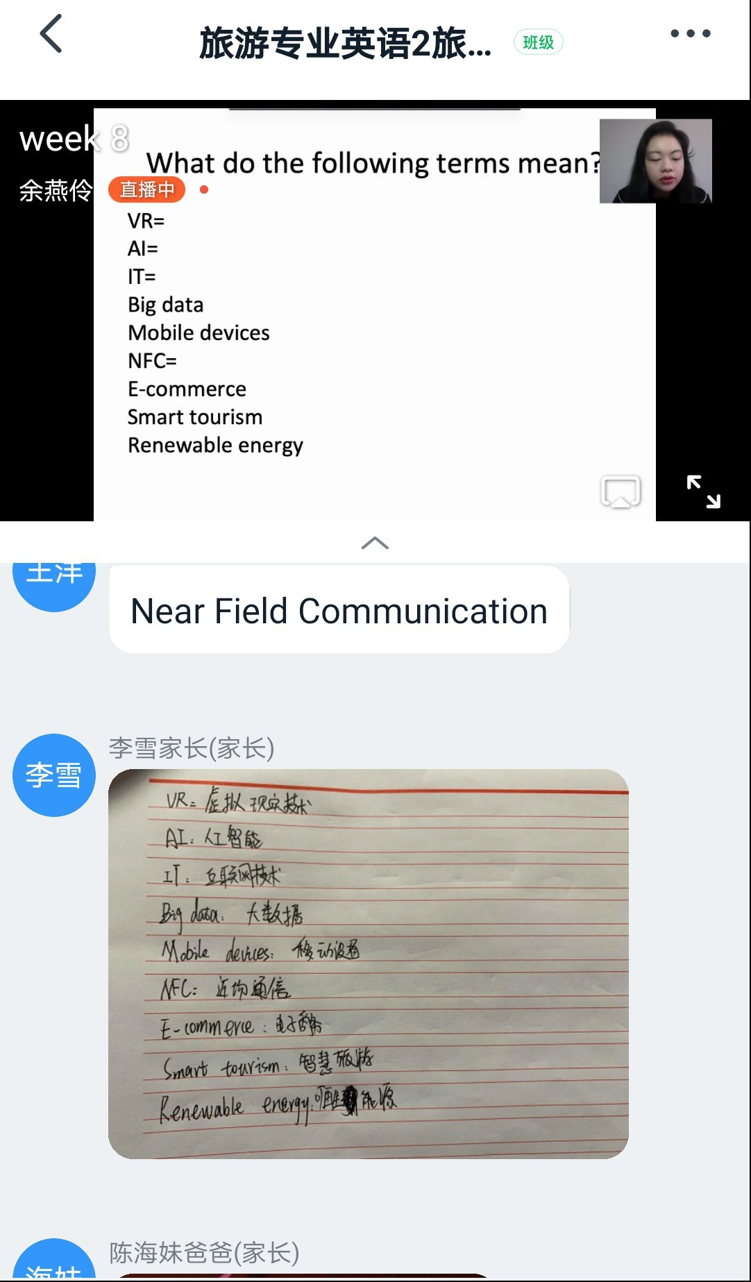 从接到线上授课的任务开始,余燕伶老师就已经开始思考如何在有限的线上授课时间里,既完成授课目的,又积极调动课堂气氛,提高同学们的参与度,实现同学们自主学习能力的提升,达到较好的自主学习效果。结合线上教学的特点,余燕伶老师选择了钉钉作为主要教学平台,通过钉钉可以保存教学直播录像,方便由于网络不畅不能及时加入课堂的同学进行回看,同时同学们还可以通过钉钉界面即时进行会话,完成课程中英文翻译的任务。