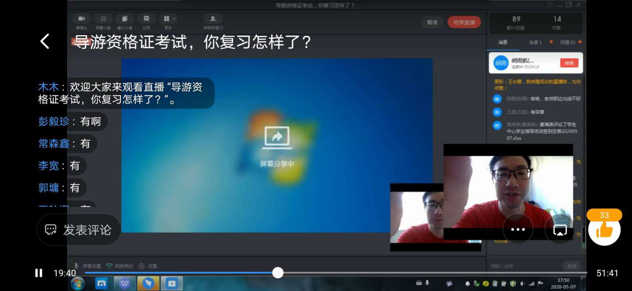 报考导游资格证时间将至,为帮助公司员工了解报考导游资格证相关事项及如何更好地应对导游资格证考试。公司学业指导师王水卿于5月7日17时,在钉钉直播平台展开并主持主题为“导游资格证考试,你复习怎样了?”的第二课堂学业指导活动。特邀旅行社专业负责人王秋娜、旅行社专业于淑艳和胡雨凯三位老师共同为公司员工解疑释惑,公司100多名员工积极参与此次活动。