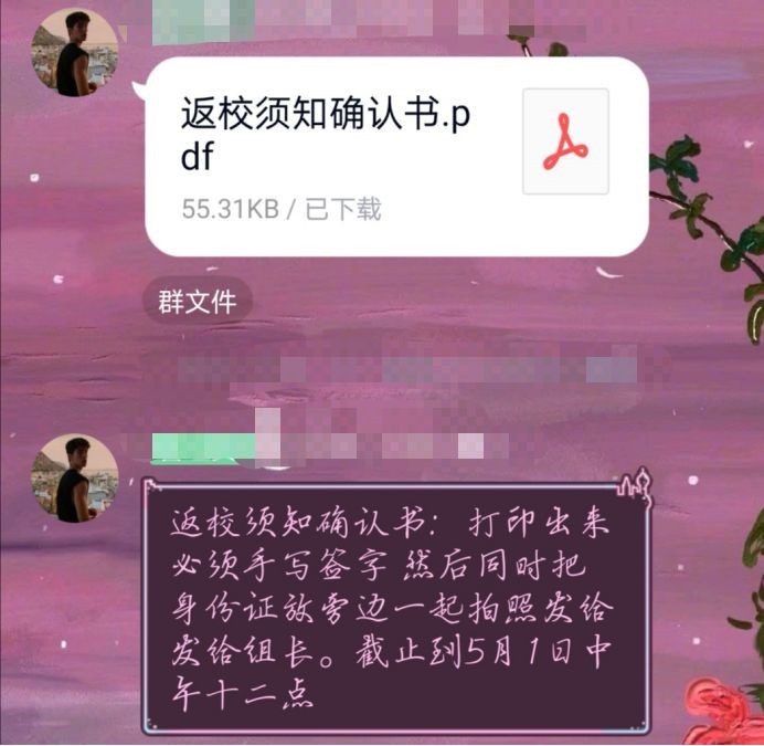 酒店1902班通知群要求员工进行返校打卡说明和返校注意事项