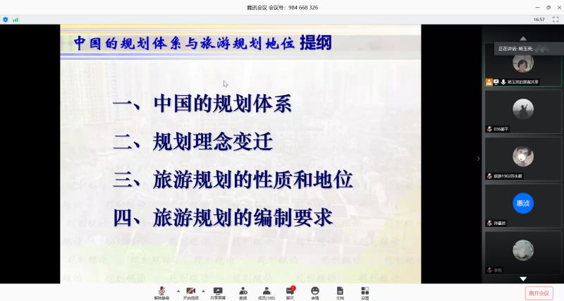 旅游规划是旅游管理专业的重要课程,也是旅游管理领域的一项重要工作,为进一步帮助金沙js5588教师更好地从事相关领域教学科研、员工专业学习,更深入系统地了解旅游规划相关知识,5月20日下午,金沙js5588经理杨玉英教授召开了主题为“中国的规划体系与旅游规划的地位”的线上学术讲座,公司师生积极参与。