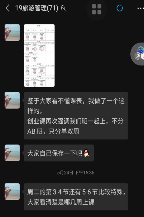 现在已经进入了上课状态,由于我们班有70多人,为了避免人群聚集,所以分成了AB班进行上课,A班线下B班和未到校同学一道通过线上进行学习,不会耽误大家的学习进程。而我们的班委也很贴心的做出了AB班课程表,及时向同学们发放了新的课程表。