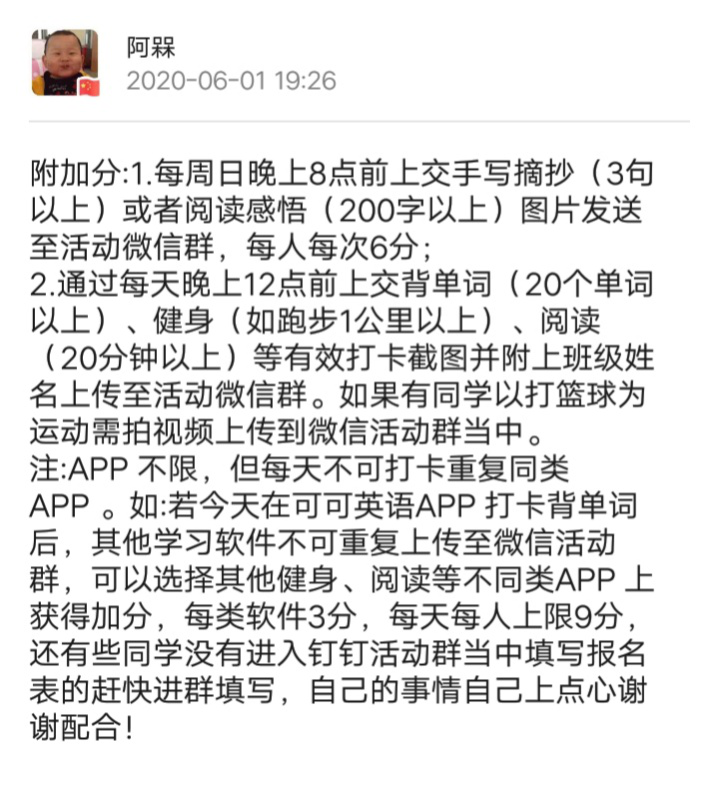 参与本次活动的员工需要在5月31日前填写“克己·阅读”活动报名表,同时加入活动打卡微信群;活动分为21天学习强国打卡积分和附加活动项目打卡截图,活动期间员工每天在群内发送阅读、背单词、运动等项目的打卡截图;活动结束后,解忧学社社员将计算员工们21天内学习强国APP上的积分和额外加分项目的积分总和,最后评选出每个年级段分数总和最高的前10名员工并给予相应奖励,获奖的员工可获得第二课堂的加分与公司颁发的相关证书。