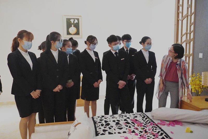 房务基础由龚慧老师主讲,此次展示着重介绍酒店客房的五大功能区域划分,让员工将实践融入专业课程知识,更真实地去感受酒店的氛围。最后,老师让同学们集思广益,分小组进行创意客房的布置。