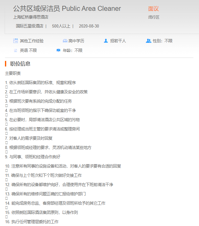 上海虹桥康得斯酒店公共区域保洁员