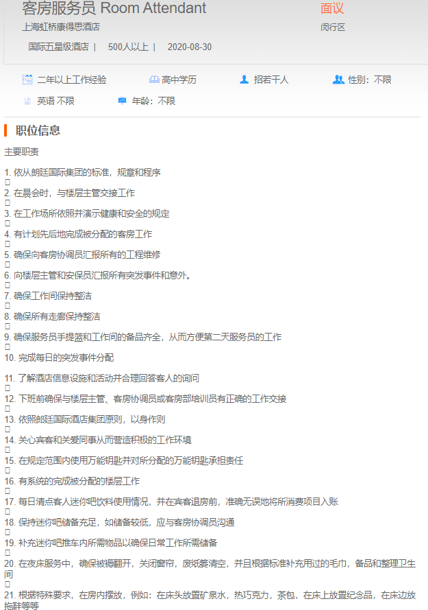 上海虹桥康得斯酒店客房服务员