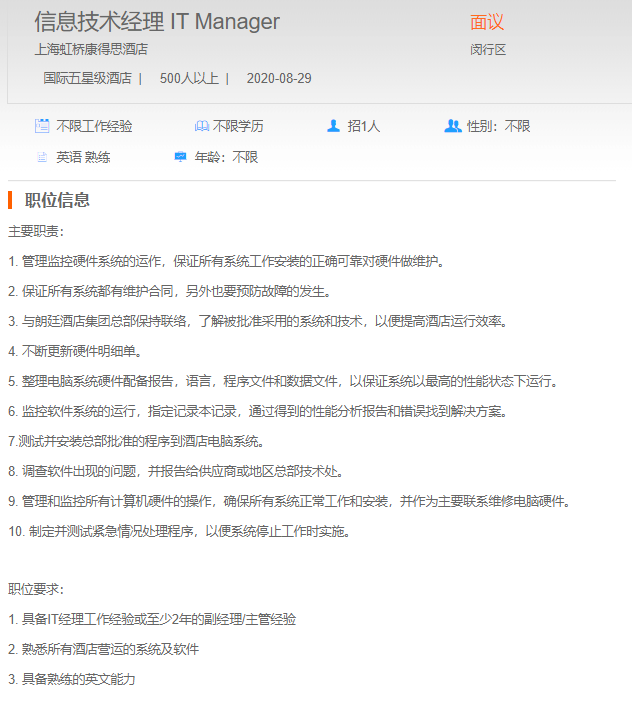 上海虹桥康得斯酒店信息技术经理