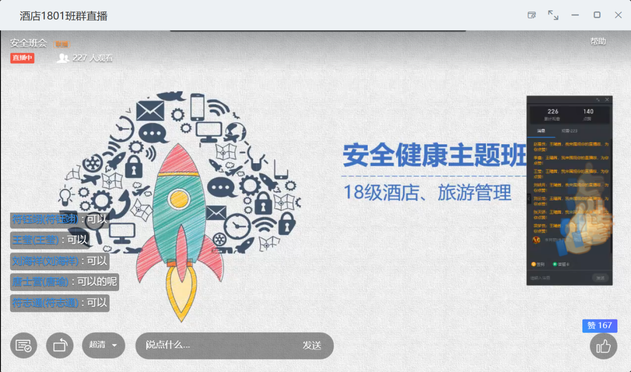 8月30日下午8时,思想导师王曦茜为18级酒店管理和旅游管理专业员工开展“安全健康”主题班会。王曦茜老师以实习安全、诈骗防范、交通安全、返校时间四个方面为切入点,向员工们详细介绍了安全教育的重要性。王曦茜老师提醒返校前细心打包行李,返校时注意健康码打卡,返校后需按时缴纳学费。最后思想导师王曦茜祝愿员工实习顺利、平安返校。