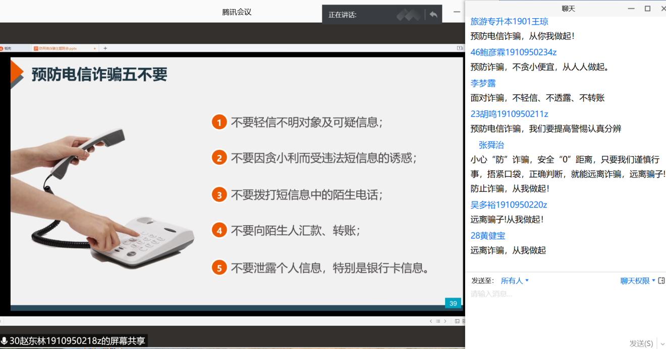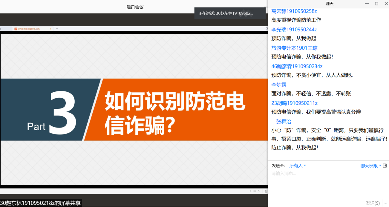 今天旅游管理专升本1901班就“如何预防电信(网络)诈骗”开设了线上主题班会,使同学们防患于未然。