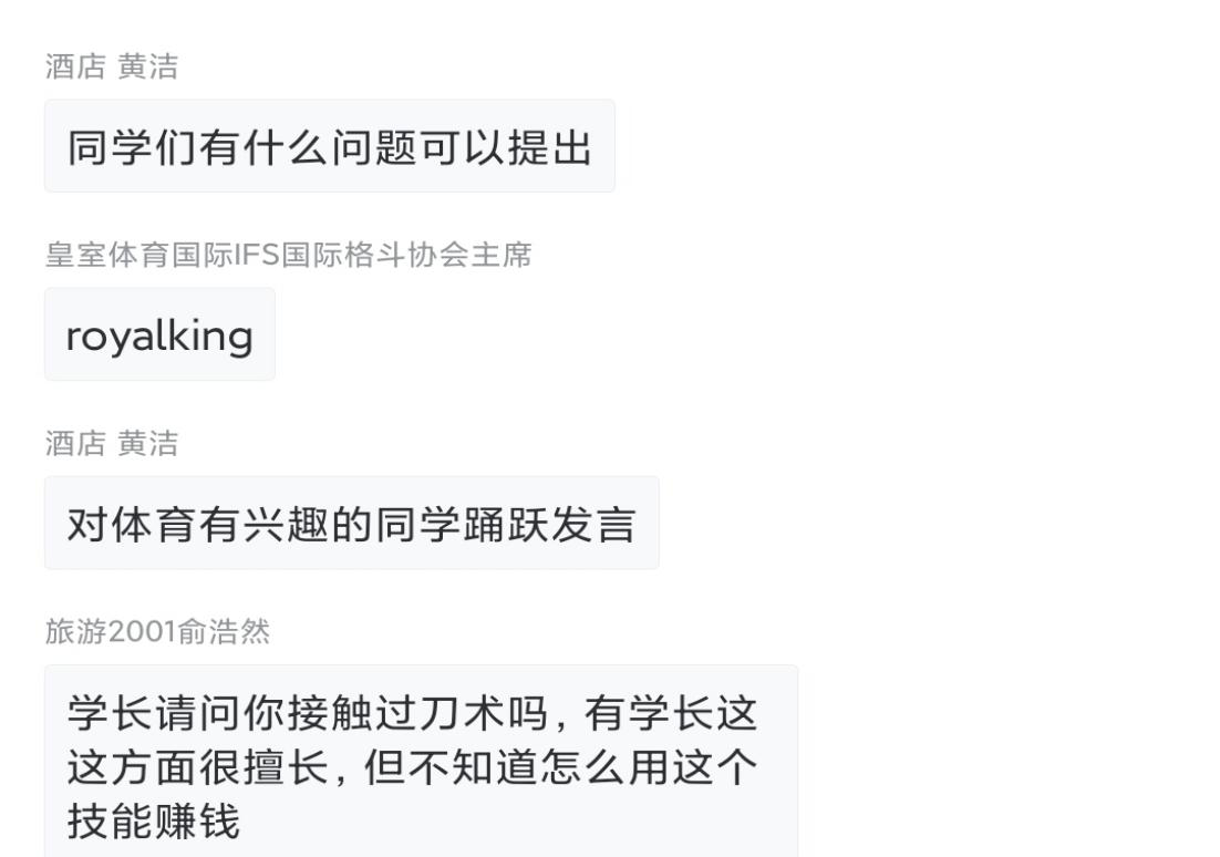 此次会议的主讲人何俊材,毕业于金沙js5588旅游与酒店管理公司2010级高尔夫1002班,现任于香港(国际)皇室体育产业发展集团有限公司董事长、皇室体育文化传播海南经济特区有限责任公司董事长、搏击国际联盟(FIA)主席(黑带七段,高级教练,高级裁判)、国际螳螂拳联合协会(IMBS)执行主席、国际格斗协会(IFS)主席、三亚市搏击协会主席、三亚市武术馆馆长、三亚搏击培训基地主席、皇室搏击健身俱乐部总经理。