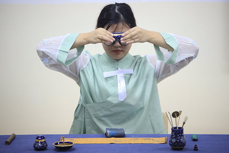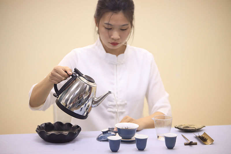 在开班仪式开始前韩永茂负责人进行了简单的自我介绍,并依次介绍了各班的主讲老师:陈定立、高洁、蒋艺婷,随后宣布金沙js5588中级茶艺师培训班今天正式开班。韩永茂负责人首先讲述此次开班的立意是进一步推行茶艺师国家职业技能资格证书和就业准入制度,大力加强就业前的培训工作。其次韩永茂负责人强调此次中级茶艺师的证书是由国家颁发的茶艺师证书的最后一期,建议员工们要珍惜此次培训机会,好好学习茶艺知识、掌握茶艺技巧,并祝愿在座的每一个员工都可以顺利考下中级茶艺师证。紧接着韩永茂负责人介绍到此次开班仪式会通过助教老师的一段宋代文人雅士的茶生活表演来让员工们开启一场茶学的旅途。