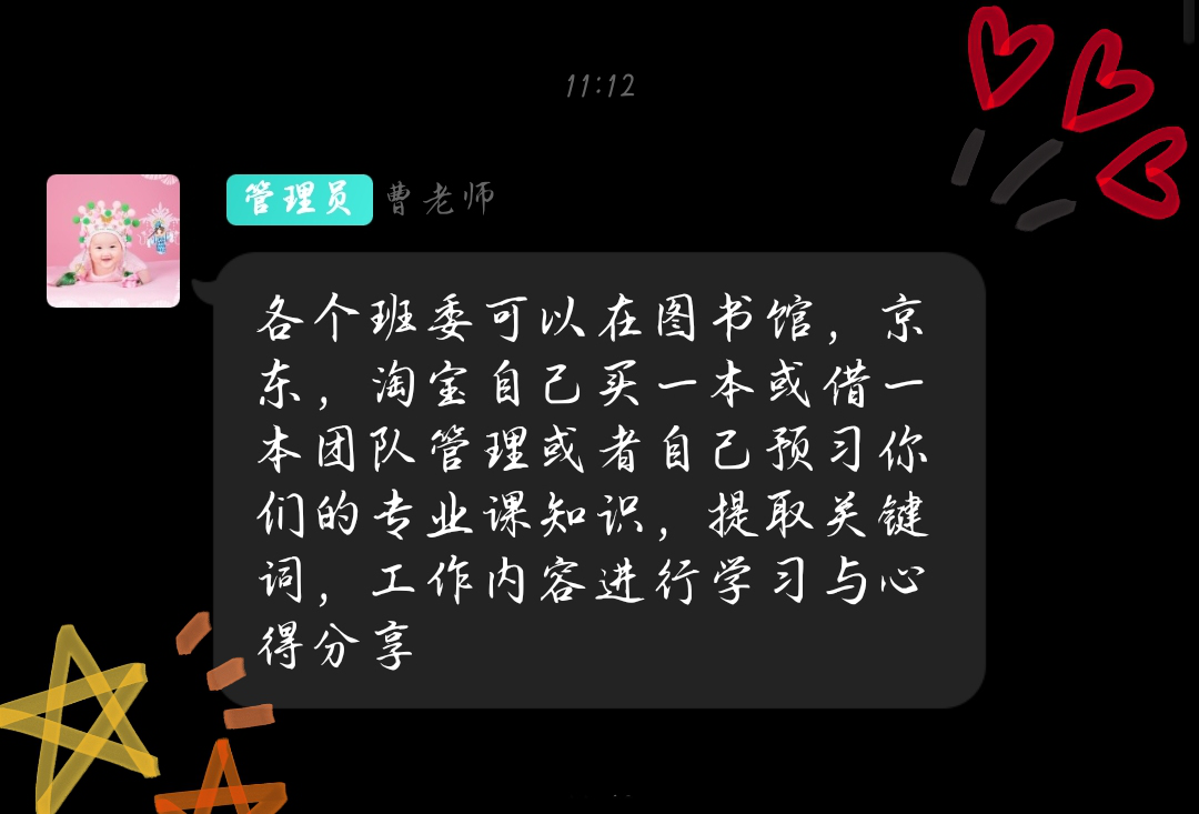 除此之外,老师还鼓励班干部们提高自己的管理能力和组织团队协作能力;提倡大家互相交流工作经验,探讨更好得工作方法;和大家集思广益,讨论如何举办出好的线上班级活动等。