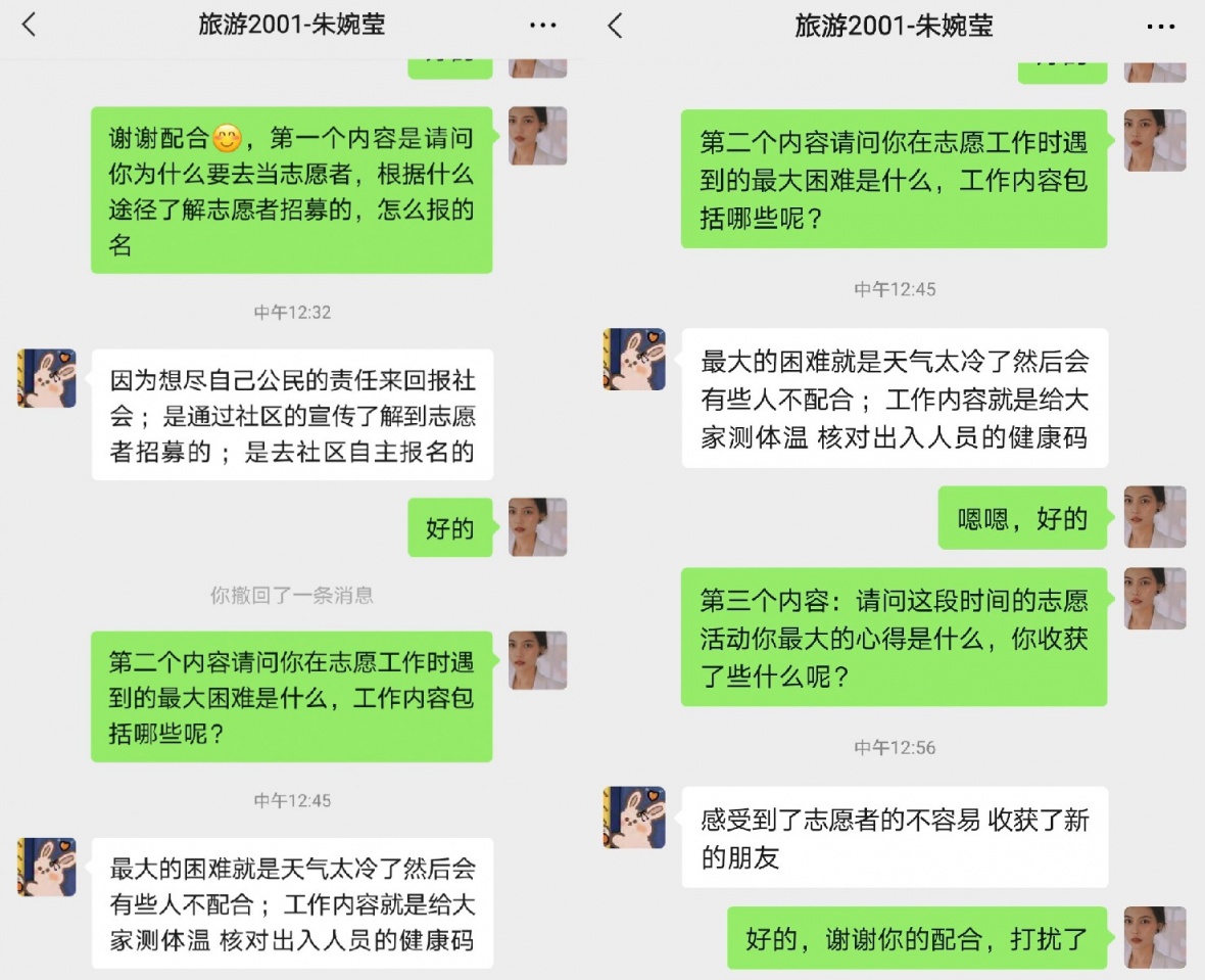 事实证明,危难时刻、紧要关头,青春力量没有退缩,而是主动请缨、积极应战。旅游2001班员工朱婉莹想尽自己公民的责任来回报社会,寒假期间她通过社区的宣传资料报名参加了社区的防疫志愿活动。朱婉莹的主要工作是给社区居民测体温,核对出入人员的健康码。通过本次志愿工作,朱婉莹切身感受到了志愿者工作的不易,但正因为有这些可爱的人在默默坚守,人民才能多一份心安。