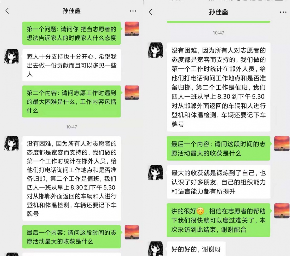 出生在物资丰盛的和平时期,成长于互联网飞速发展的信息年代,90后、00后一度被人们贴上关注自我、特立独行的标签。但是在疫情面前,他们用“自己的方式”勇敢地站了出来,不畏艰险地忙碌在抗疫战线。员工孙佳鑫提出想参加社区疫情志愿者活动时,她家人很欣慰并且积极支持她的想法。采访中,孙佳鑫高兴地提到她的工作顺利开展,所有人对志愿者的态度都是宽容且支持的。他们的第一份任务是统计邯外人员,打电话询问邯外人员的工作地点和是否有准备归邯的意愿;第二份任务是社区值班,“我们四人一班从早上八点半到下午五点半,志愿者们需要对从邯郸外面返回的车辆和人进行登记和体温检测,车辆还要记下车牌号,严格按规定执行工作。”孙佳鑫表示此次志愿活动最大的收获是锻炼了自己的意志,广识益友,而且自己的组织能力和语言能力都有所提升。