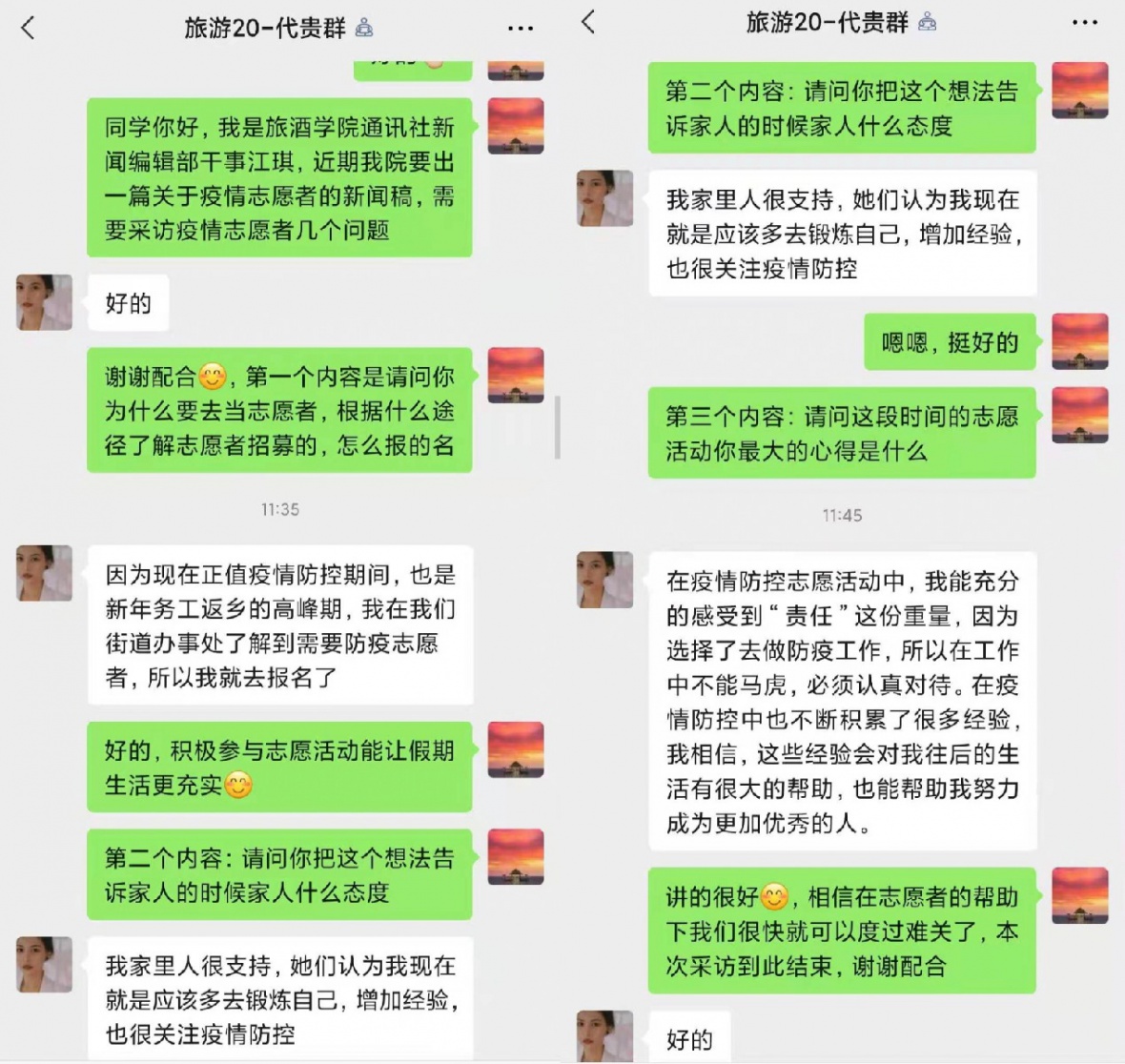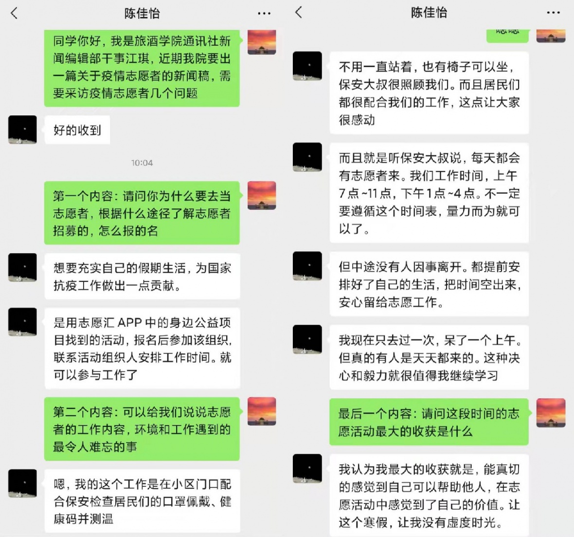 “想要充实自己的假期生活,为国家抗疫工作做出一点贡献。”这是旅游2002班员工陈佳怡报名参加志愿者活动的目的。员工陈佳怡在家通过手机软件“志愿汇”报名参加了志愿组织。她在采访中谈到了这段时间她参加志愿工作的具体内容:“我的工作是在小区门口配合保安检查居民们的口罩佩戴、健康码并测温。居民们都很配合我们的工作,每天都会有志愿者来,志愿者们会提前安排好自己的生活,把参加志愿活动的时间空出来,全心投入志愿工作。有人是天天都来的,这种决心和毅力就很值得我继续学习。”在采访最后,她谈到了“参加志愿活动能真切的感觉到自己可以帮助他人,感觉到自己的价值,防疫志愿工作,让我没有虚度时光。”