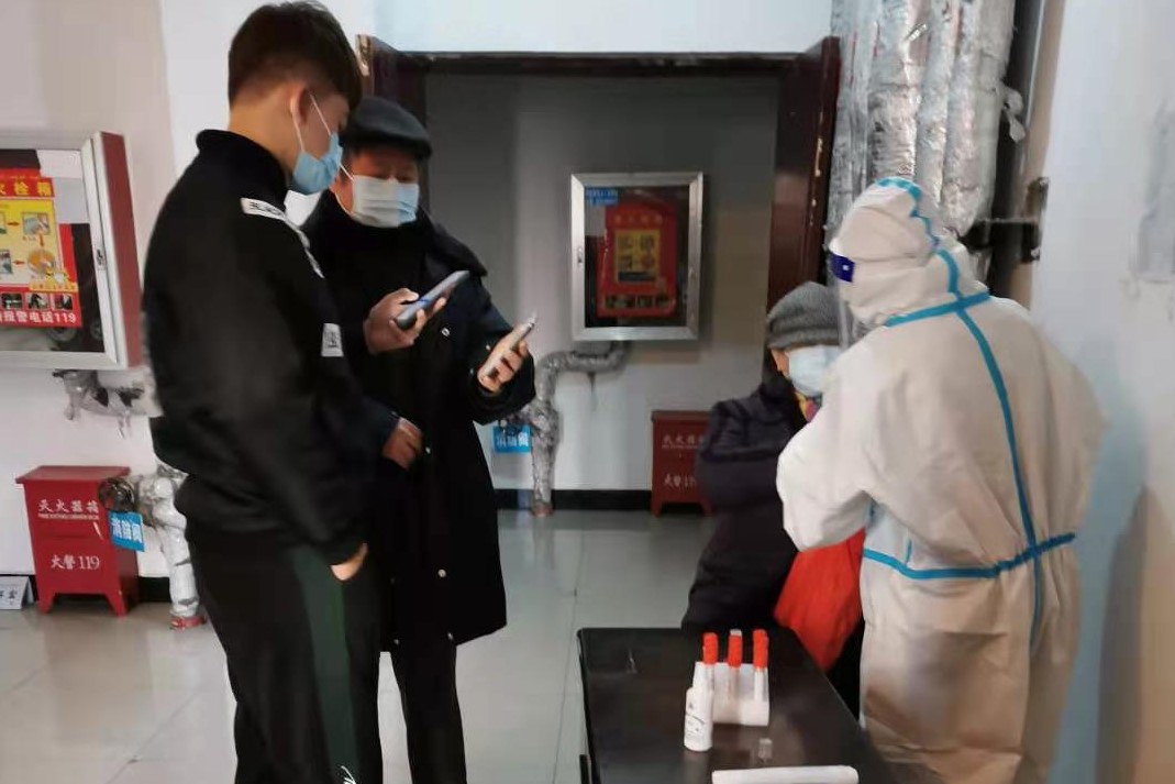 员工志愿者凯撒尔江(图中左一)参与防疫志愿工作