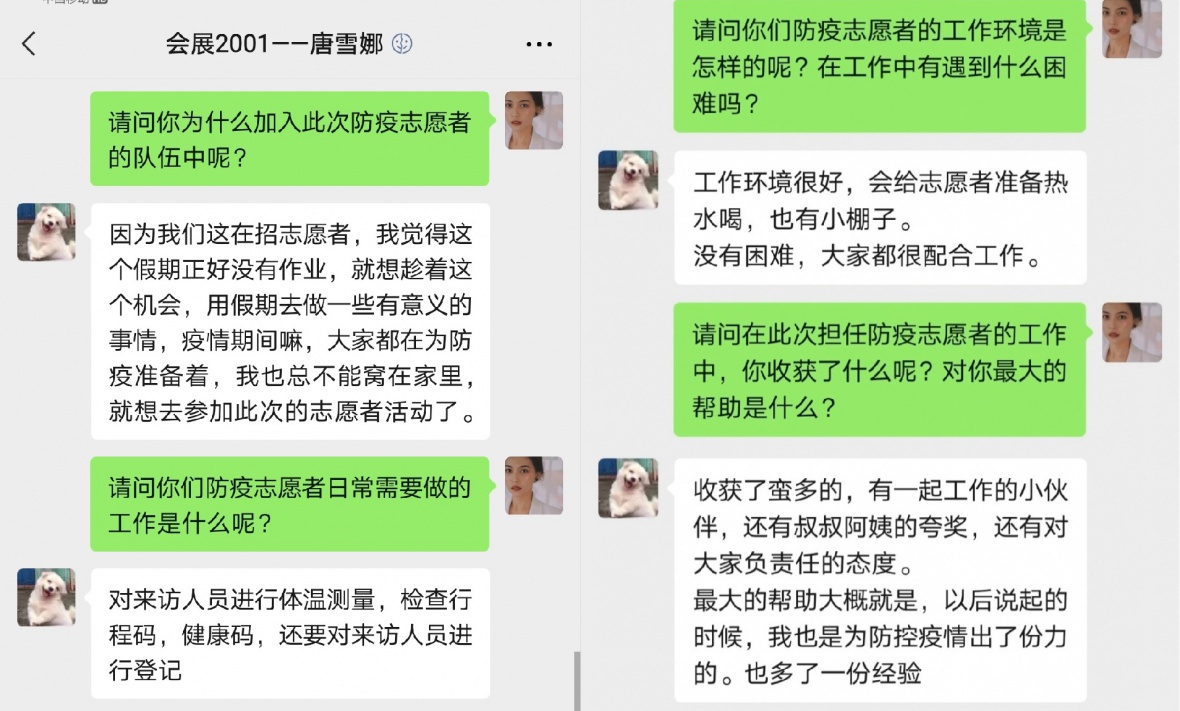 没有从天而降的英雄, 只有挺身而出的凡人。公司会展2001班的唐雪娜本着提升自我和为疫情防控出一份力的初心,主动报名了老员工疫情防控志愿活动,为疫情防控战助力。唐雪娜见证了2020年疫情初期防疫志愿者们的辛苦工作,在全民共同抗疫的2021年,她也毫不犹豫地加入了老员工防控志愿者的队伍,希望为自己的假期增添不一样的色彩,让其变得更有意义。对于担任此次防控志愿者,唐雪娜谈到:“在今年的疫情防控工作中大家都很配合,没有发生争执或者不满的情况。虽然是大冬天在户外工作,但是相关工作人员为志愿者们提供了良好的工作环境——提供了志愿者们休息的小棚子,还准备了充足的热水。这段时间最大的收获是拥有了与工作伙伴间的友谊、叔叔阿姨的夸奖,丰富了实践经验。”