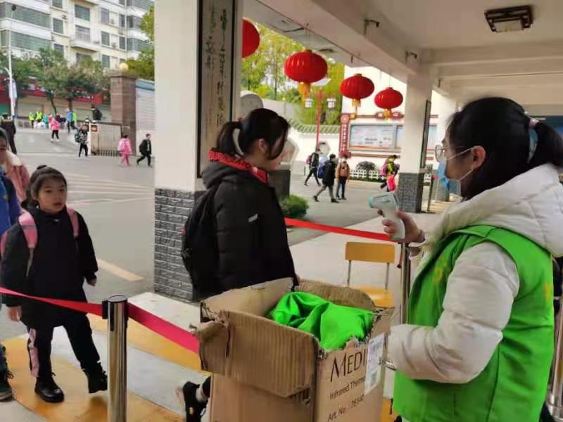 员工志愿者戴紫嫣进行测量体温的志愿工作
