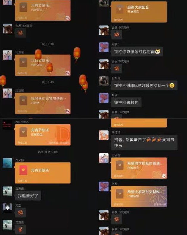 2月26日晚上9点15分我班活动正式开始,同学们踊跃参与此次活动。会议伊始,担任主持人的组织委员向同学们介绍了元宵节历史起源及发展过程,让同学们在参与活动的同时还丰富了同学们的认知。随后便是激动人心的猜灯谜时间,班委为同学们准备了各式各样的灯谜,同学们积极踊跃地抢答,直播氛围热闹非凡。随着时间的推移,“抢红包”环节也拉开了序幕。在组织委员的带领下,同学们在班群内发起了红包,活动也进入了高潮。