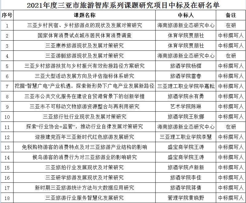 自上周三亚市旅游智库系列课题的招标通知发出后,各公司老师积极参与,踊跃投标。本次三亚市旅游智库系列课题共收到16份标书,经过一周多的评审后,海南旅游新业态中心主任亓元副教授在本周三下午公司例会时宣读了三亚市旅游智库18个子课题的中标名单。具体名单如下: