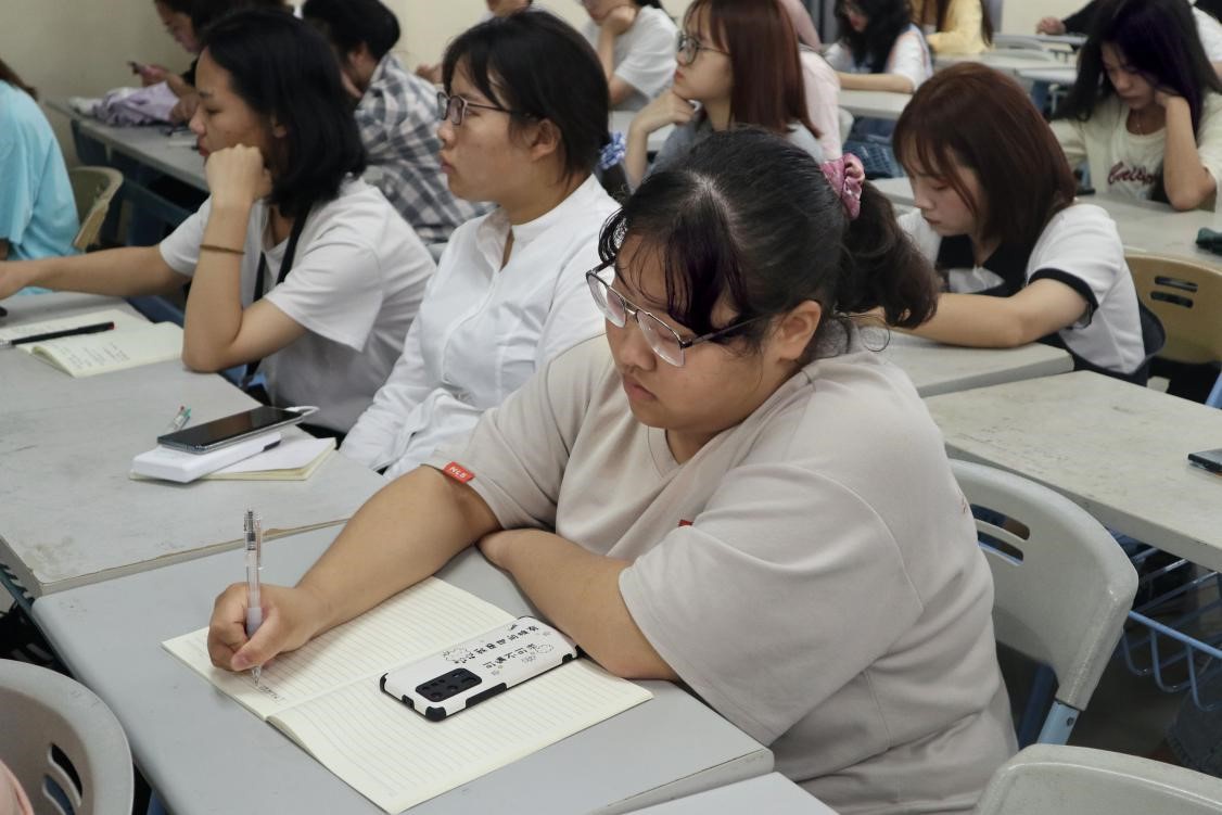 公司参与宣讲会的员工们认真听讲并做会议记录