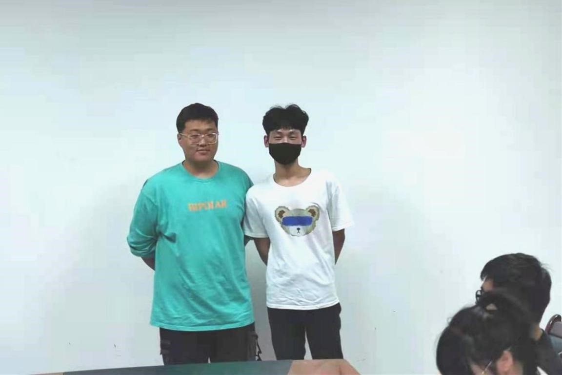 邮轮1801班班长兰宇昂与邮轮1901班长周宇作为班级代表合影留念