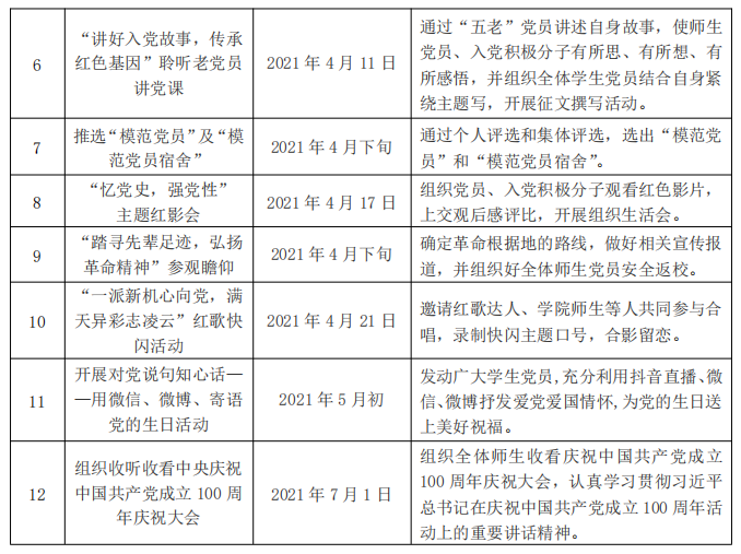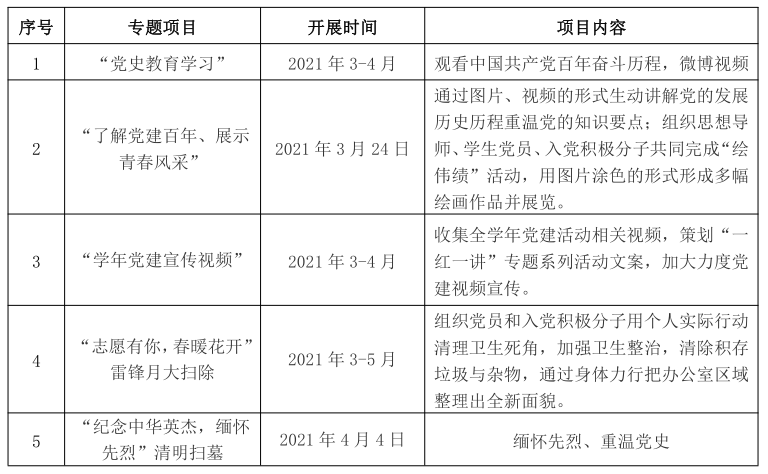本次主题系列活动分别以“党史教育学习”、“雷锋月大扫除”、“缅怀先烈”、“了解党建百年、展示青春风采”、“学年党建宣传视频”、“讲好入党故事,传承红色基因”共12个版块开展系列主题党日活动。活动详细介绍如下: