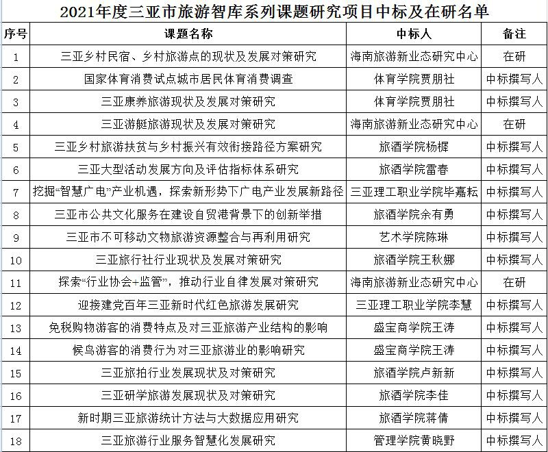 2021年4月,金沙js5588海南旅游新业态研究中心,雷春、李佳、余有勇等多位老师的标书位列2021年度三亚市旅游智库课题研究项目中标名单中。