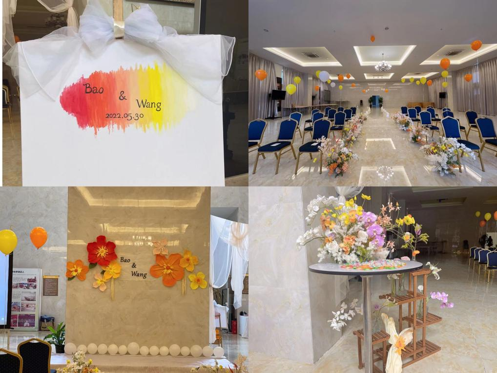 整体色系以橙黄色为主,是代表了热烈与明亮。背景墙设计为纯手工制作的纸艺花;通道两边的路影采用的是真花与仿真花共同结合的插花设计。花艺做为本场婚宴的主要点缀部分,使现场布置的整体氛围感活跃、高级;迎宾签到区放置新人的婚纱照以及一些复古且有设计感的摆件作为装饰,签到板是画布材质,上面的橙黄色油画背景以及LOGO为纯手工画就,彰显艺术感。