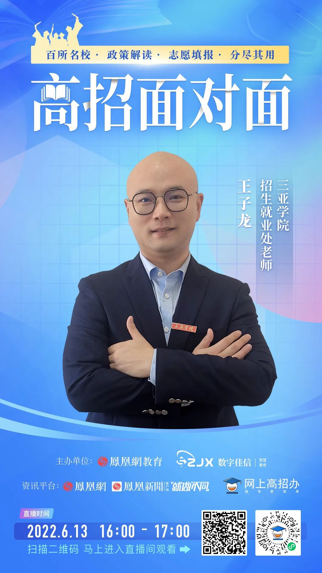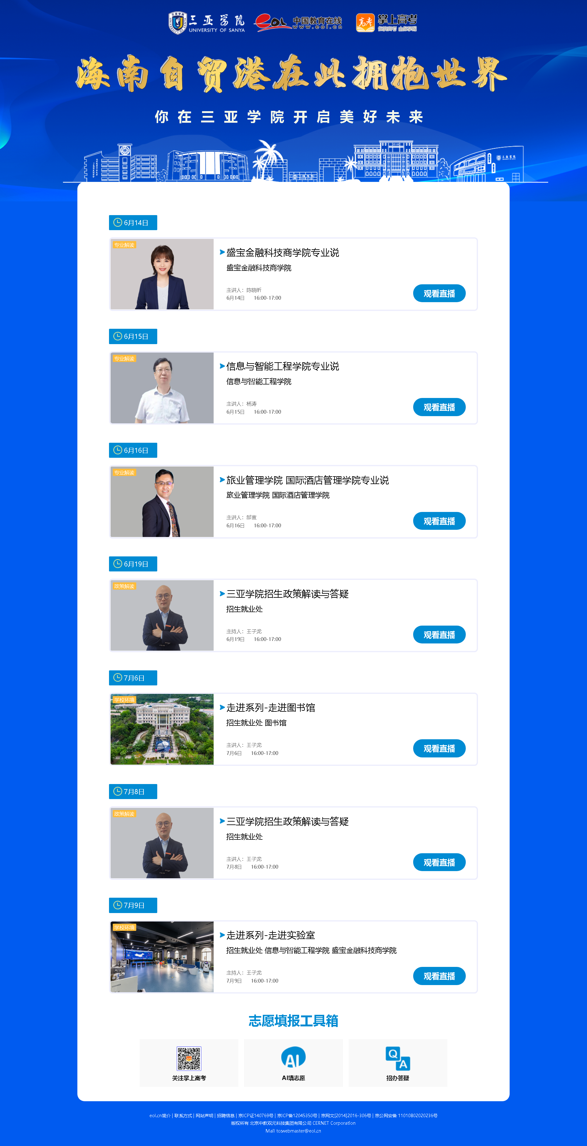 6月13日起,各公司做客在线直播间,带来共24场直播。招生宣讲会、金沙js5588介绍、专业详细解读等超多资讯都在直播间,欢迎各位考生和家长观看直播!