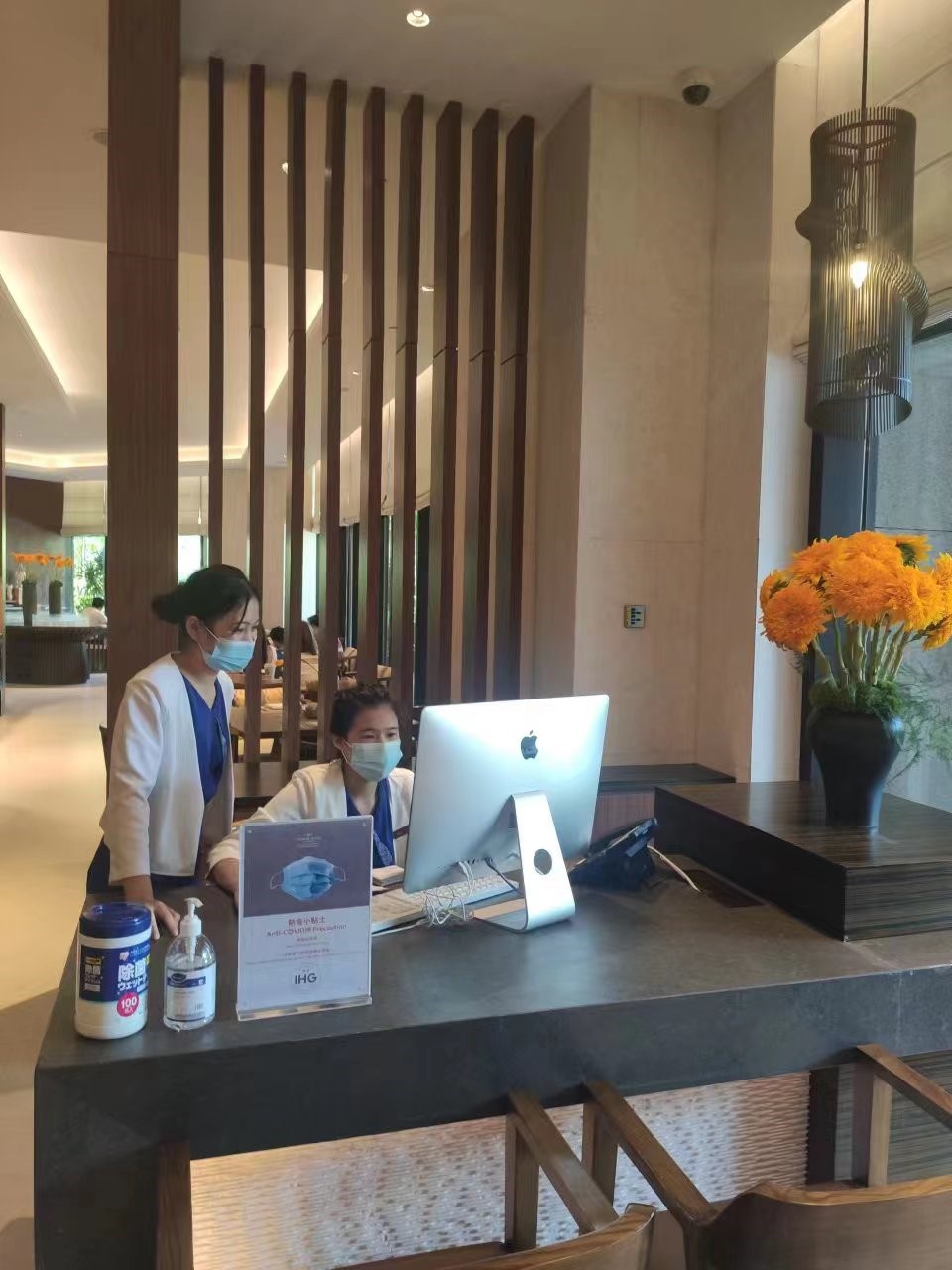 此次来海棠湾仁恒皇冠假日度假酒店的金沙js5588实习生共八人,八人都在前厅部,其中一人在宾客关系部、三人在总机服务部、三人在行政酒廊,还有一人因为疫情原因还未上岗。宾客关系部主要工作是加客人微信,与客人沟通为客人服务的管家角色,其次工作就是在大堂指引客人、帮客人办理快退和协助前台帮客人办理入住等等。总机服务部主要工作是接听内外线电话、转接电话、为客人预订房间、解答疑惑等等。行政酒廊主要是负责钻石会员、套房和行政房的客人。主要工作为询问客人的房号,引领客人入坐,询问客人想喝的饮品,在客人用餐期间巡台,收取客人桌上的空盘子。下班前对今天用餐人数进行填表汇总,和对咖啡机的用量进行汇总等一系列工作。