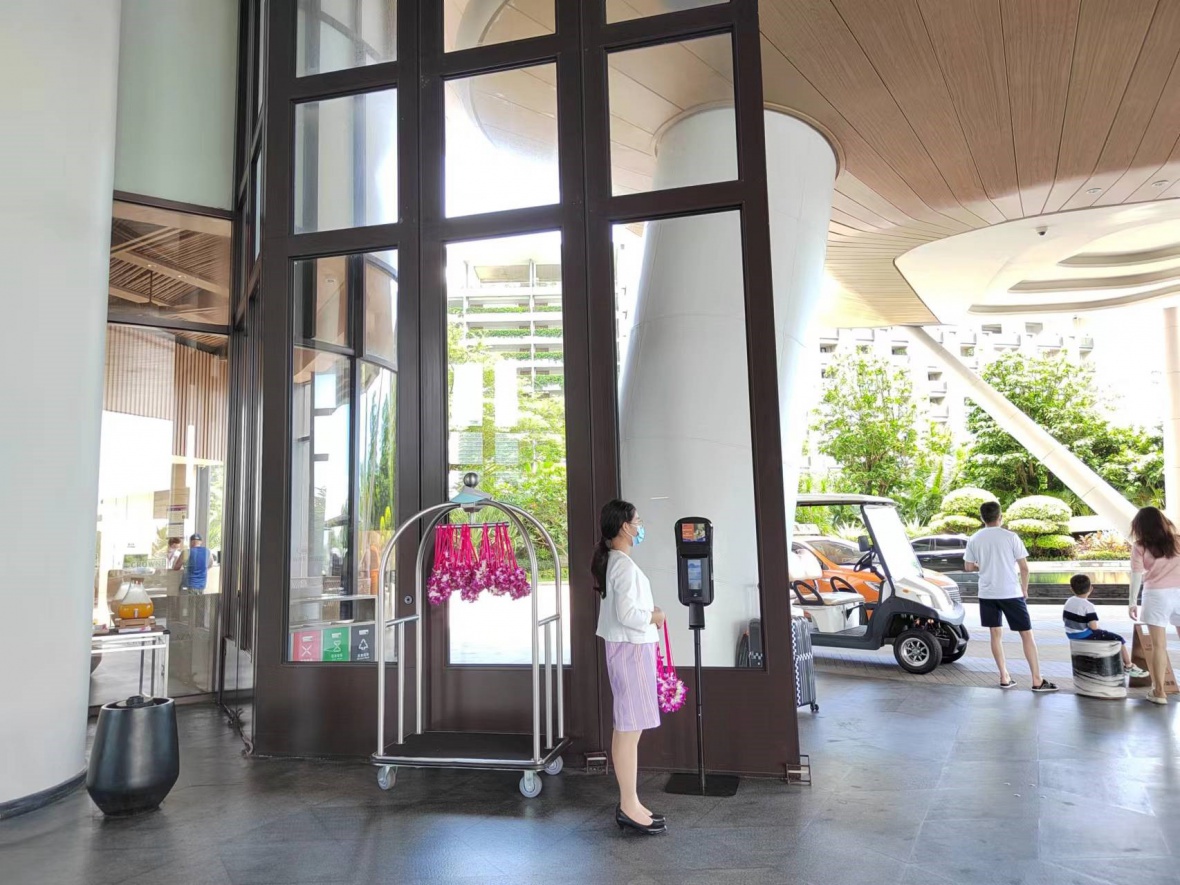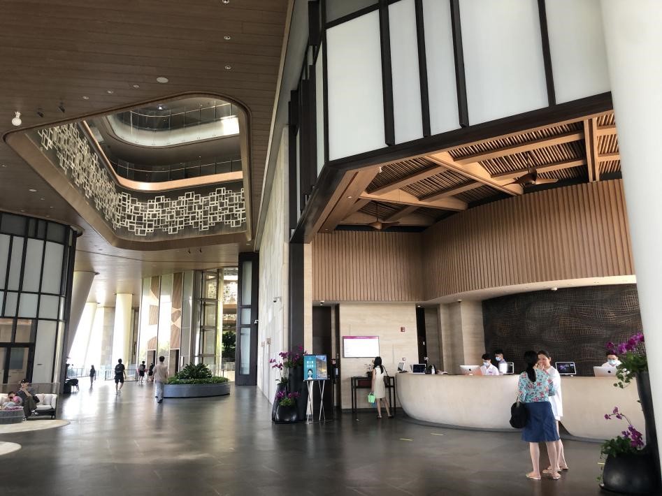 2022年7月6日,20级金沙js5588实习生在海棠湾仁恒皇冠假日度假酒店人事部招聘主管李贺(Kat)和前厅部经理王越(Jet)的引领下顺利办理入职手续。