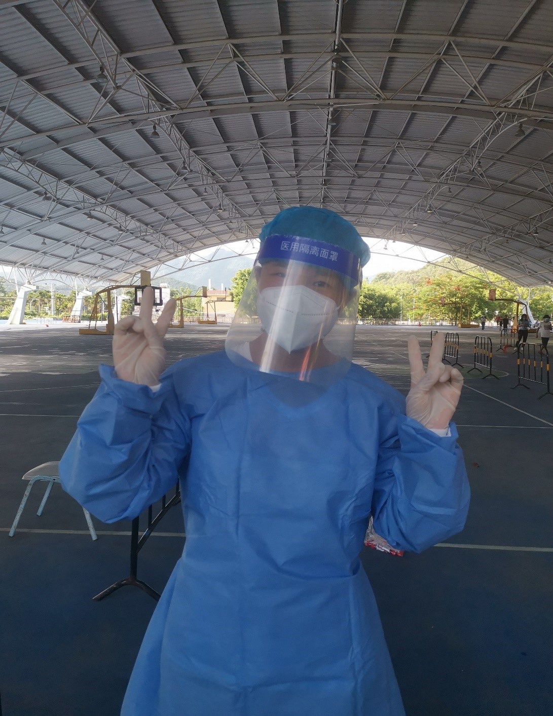 随后公司通讯社干事采访赵小丽老师时,老师对此表示:即便在疫情期间也可以让公司保持安全,用焕然一新的面貌迎接同学们的到来。在核酸检测时通过提前学习手机操作,发现也没太大的困难,反而觉得疫情期间能够在校做防疫志愿者而感到骄傲。在赵小丽老师检测的核酸队伍中大部分都是海南人,会出现听不懂海南话的问题,在其他工作人员的协助下愉快的完成守护校园的职责。赵小丽老师觉得很自豪能够在抗疫期间做出一份小小的贡献,虽然大家都穿得严实并不知道彼此是谁,可是一个眼神也知道大家都在为抗议共同努力中。