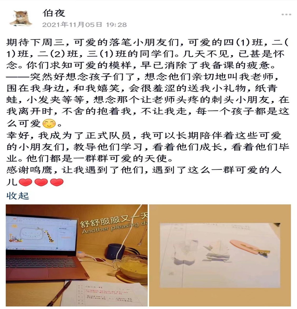 在我的心里,曾有一个教师梦,毋庸置疑我选择了加入鸣鹰支教队。在这个社团里,队长和督导都温柔亲切,支教队的大家都很真诚善良,这样的大家庭,十分慰藉异地求学的我。