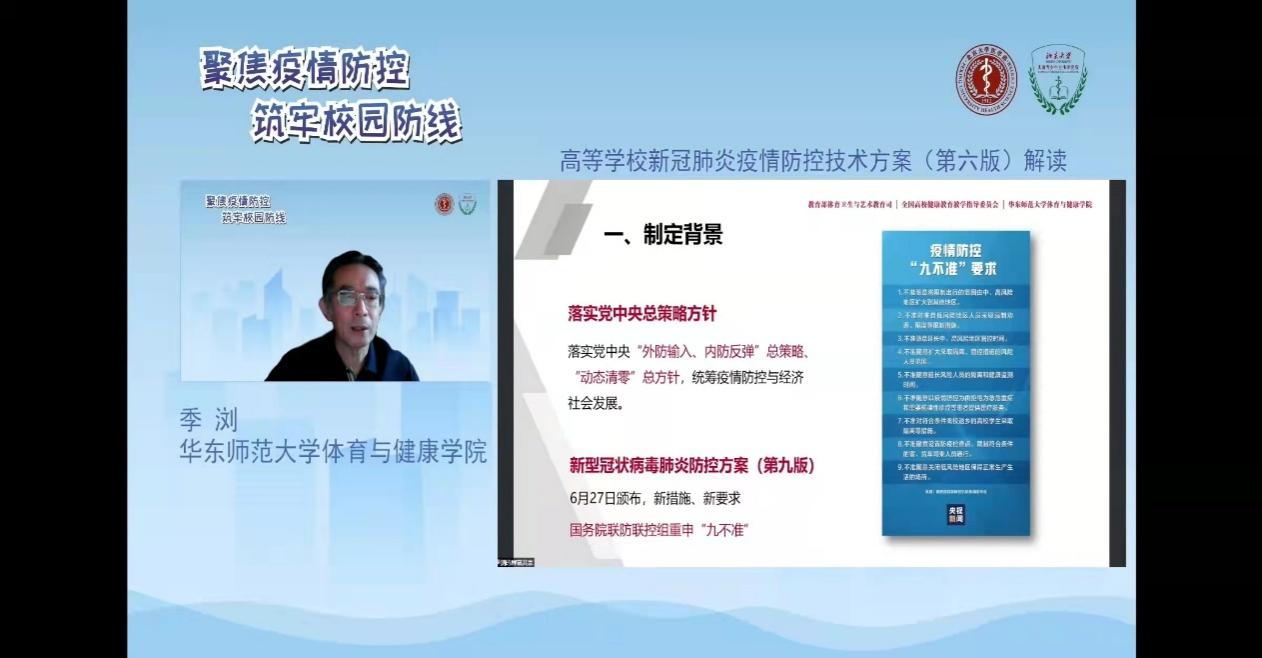 其中,华东师范大学体育与健康公司季浏为大家解读高等公司新冠肺炎疫情防控技术方案第六版解读,其落实党中央总策略方针及新型冠状病毒肺炎防控方案(第九版)注意常态化防控注重维护和恢复校园秩序应急管理对接公司所在的防控要求。