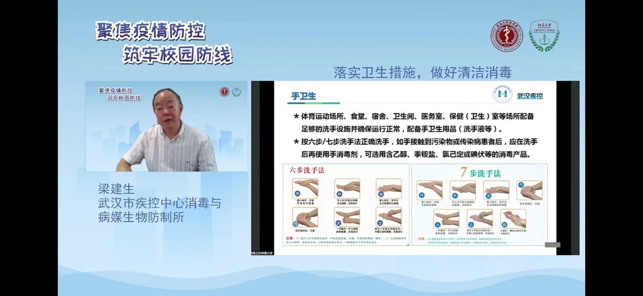 武汉市疾控中心消毒与病媒生物防制所梁建生老师讲解到:落实卫生措施,做好清洁消毒,注意个人防护。这毋庸置疑是十分重要的,病毒无处不在,师生不可抱有任何侥幸心理,预防性消毒措施可更好的保护广大师生的身体安全。