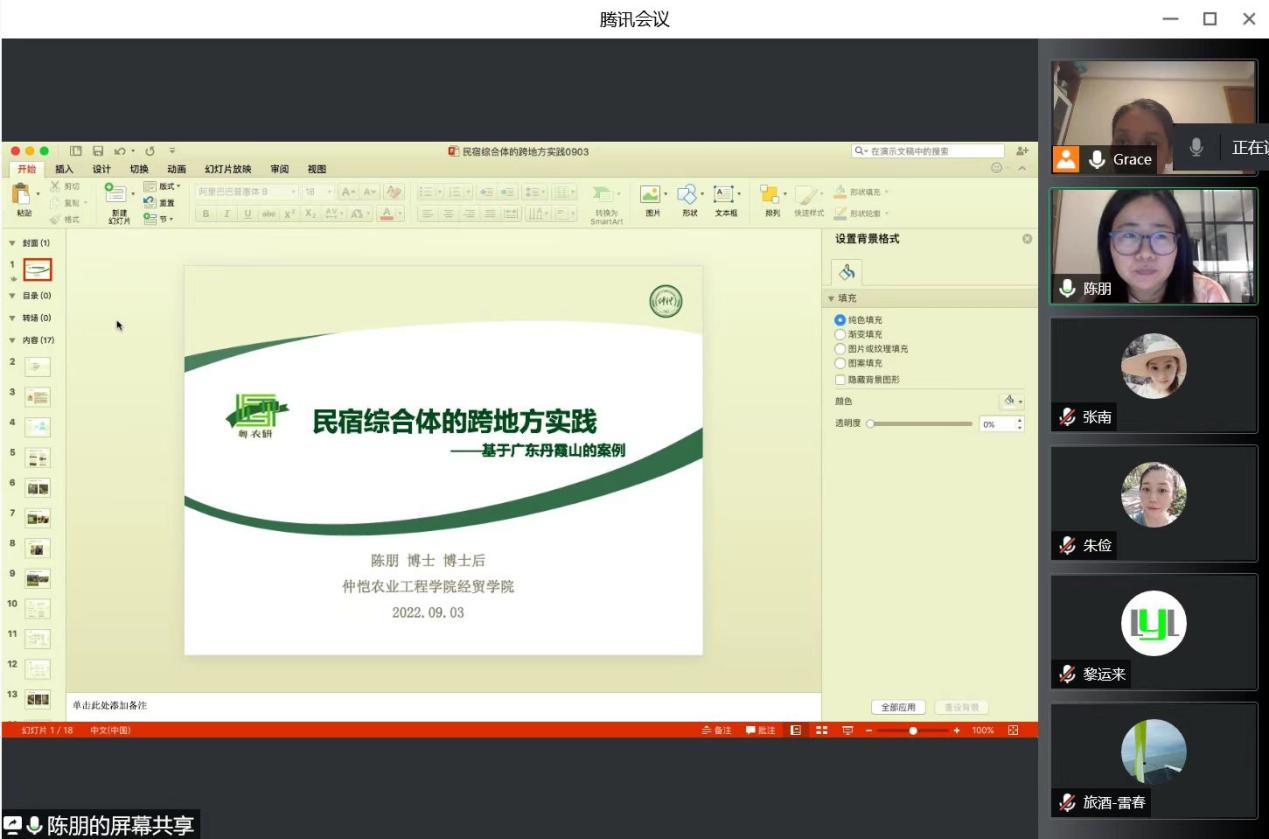 随后,仲恺农业工程公司的陈老师结合暑期调研,分享了旅游民宿综合体的跨地方实践——基于广东丹霞山的案例。通过长期追踪,对广东丹霞山的特色民宿主理人进行访谈,了解当地旅游民宿的发展状况。陈老师分享了四个案例:山原色、碧水花寨、丹霞印象和爱树——丹霞山苑。四家民宿在发展过程中都实现了市场的跨地方、资源的跨地方和人员的跨地方。并探讨了民宿的可持续经营问题和民宿与农村区域的融合发展问题。