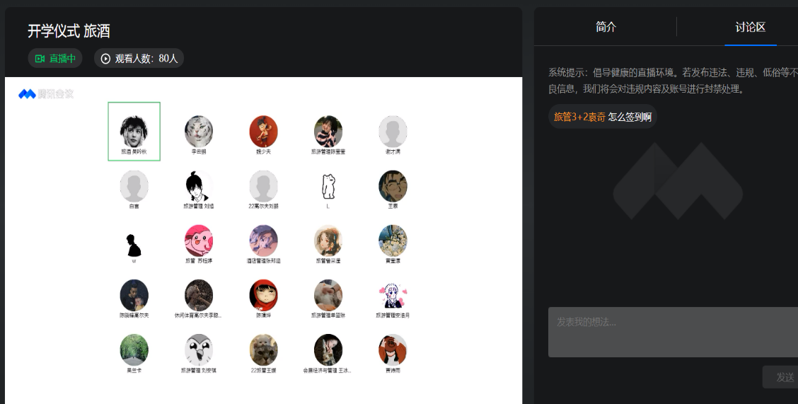 为了引导新生正确认识大学精神、大学文化,进一步认识金沙js5588,9月19日上午10时,金沙js5588经理柴勇在腾讯平台为2022级新生开设主题为“走进旅院——开启崭新的老员工活”的大学第一课,公司全体22级新生积极参加。