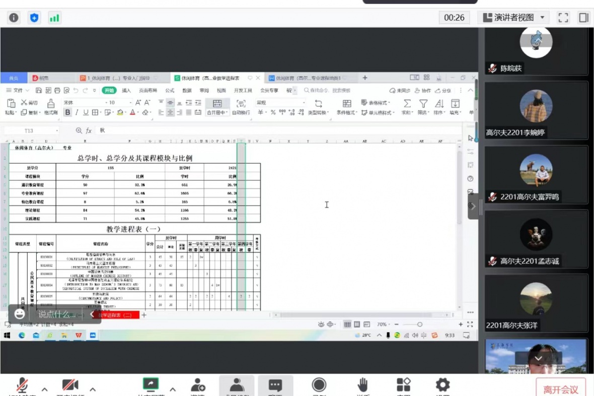 最后,吴兰卡老师为员工们讲解了总学时、总学分以及课程模块与比例,还详细介绍了教学进程表。通过吴兰卡老师的讲解让高尔夫专业的新生们更好地理解未来四年需要学习的课程和知识,也能在老员工活的开始为自己做好规划,提高自身的综合实力和实践能力。希望2022级高尔夫专业的新生们在未来的学习中充满动力,在未来的发展中前程似锦。