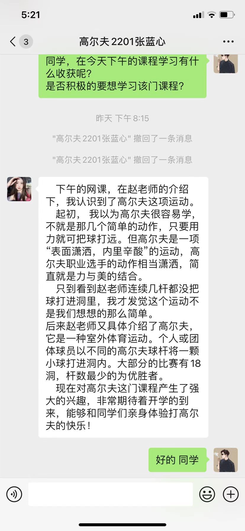 在本次会议课程结束过后,公司通讯社干事对22级高尔夫员工进行了线上采访。当询问王崇鑫同学,在此次课程学习到了什么,王崇鑫同学表示:赵达老师通过这次课程,带我们新生了解了高尔夫球场的基本构造,同时演示高尔夫基本打法,在其中也学习到了许多专业知识,例如,几号洞和码数一类的知识。再对张蓝心同学采访,并表示到:经过下午高尔夫课程的学习,现在对高尔夫这门课程产生了强大的兴趣,非常期待着开学的到来,能够和其他员工们亲自体验打高尔夫的快乐。