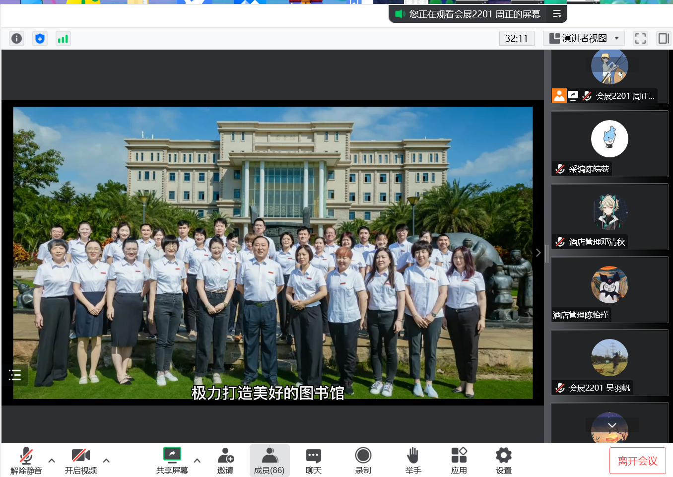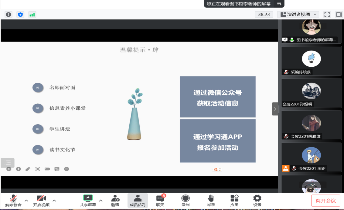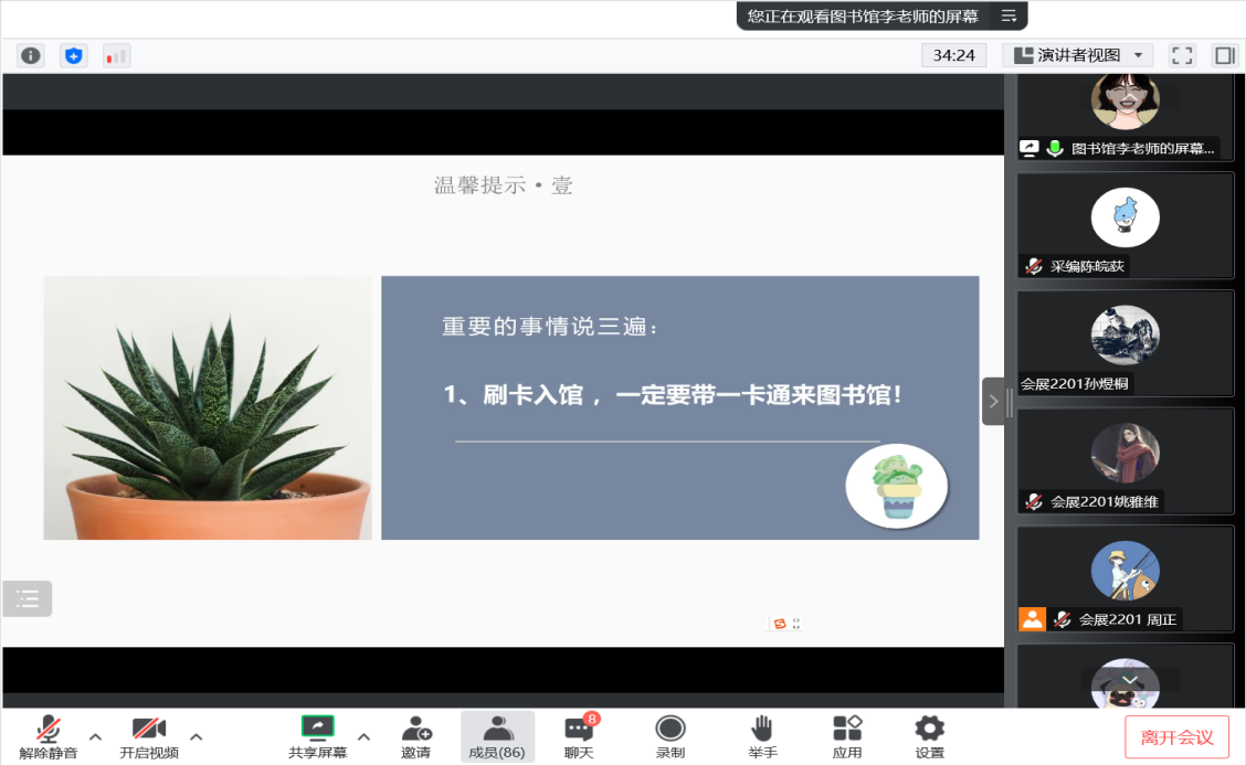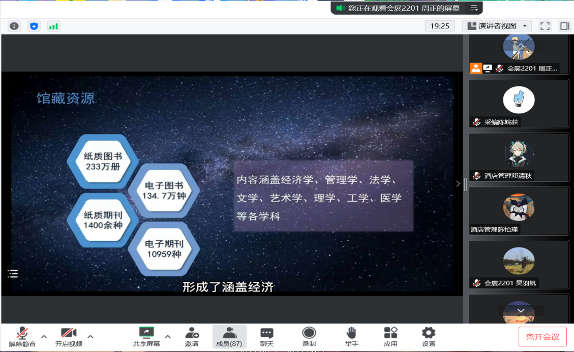 进入大学后,不同于以前初高中按部就班的学习生活的是,需要更多的自律。在大学里想要找到学习的意义,发现学习过程的美好。学习不仅仅是学习专业相关知识,而是读书丰富自己,扩充知识面。当然在大学里,图书馆资源极其丰富,为了让2022级新生们全面了解图书馆规则,公司图书馆老师于9月23日在腾讯会议为金沙js5588的新生讲解图书馆规则。公司全体新生积极参与。