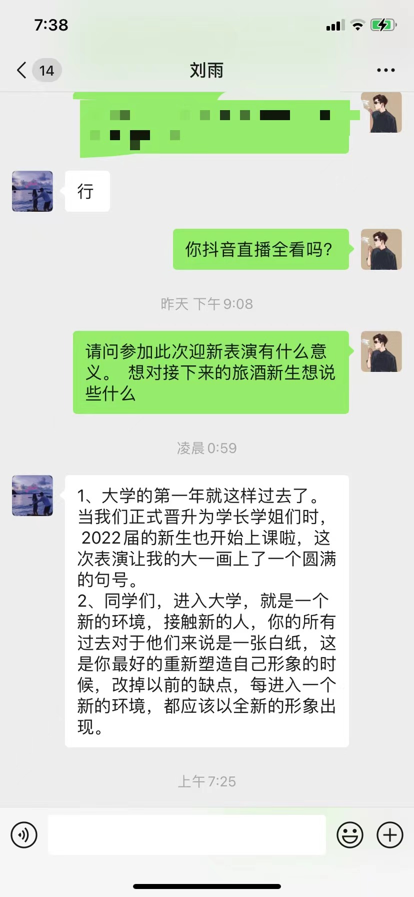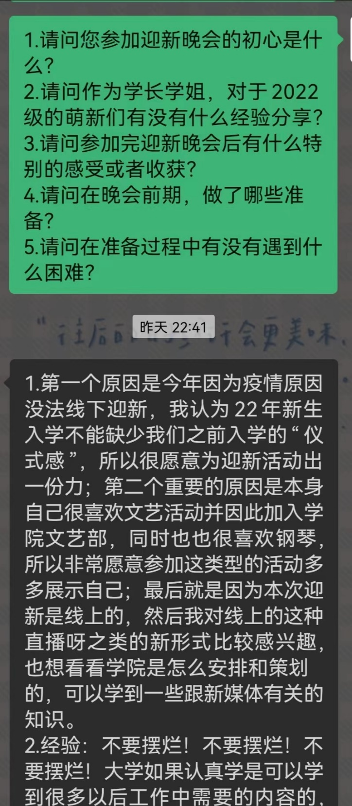 在迎新晚会结束,公司通讯社干事对酒店2101班员工刘雨进行了采访,当谈及此次迎新表演有何初衷时,员工刘雨表示:自己的大一生活已经过去,同时也正式晋升为学长,22级新生也开始正式上课,这次表演算是为自己的大一生活画上圆满句号,同时希望进下来新生们能够在大学这一新环境里,继续大步向前,实现自己的理想。同样作为文艺部的学姐赵杨溪表示因为疫情原因没法在线下迎新,但22级的新生们入学“仪式感”是不可缺少的。赵杨溪学姐提出本次线上迎新的新形式是比较吸引人的,可以学习到一些与新媒体有关的知识。同时赵杨溪学姐建议新生在进入大学后可以多参加各种活动,不仅可以增长自己的见识,也可以提高自己的沟通能力。在大学还可以积极参加员工组织,与同学们共同解决问题,互相进步。