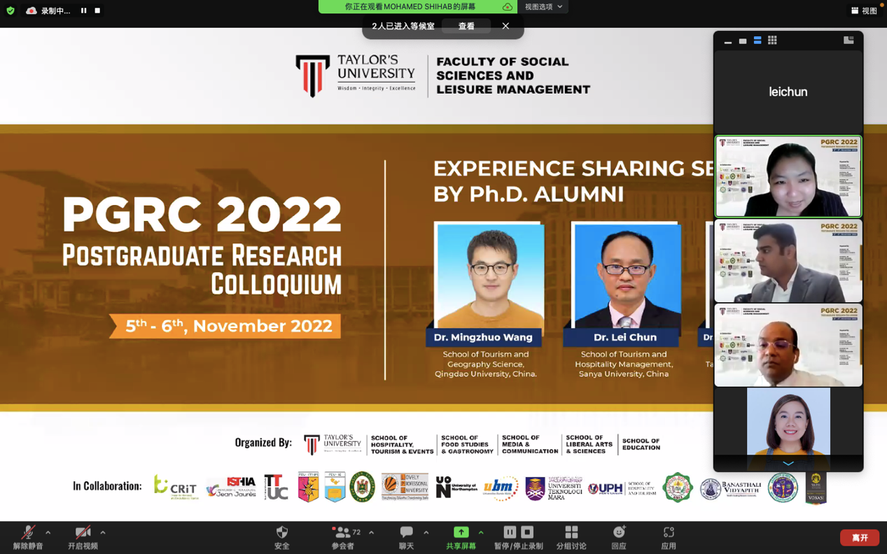 2022年11月5日下午,公司教师雷春受邀参加了由马来西亚泰莱大学举办的“社会科学与休闲管理”研究生论坛,并作为2022届泰莱大学优秀博士毕业生分享了博士学习的经验。本次论文论坛由来自包括马来西亚、新加坡、英国、澳大利亚、印度等19个国家的专家学者和博士研究生参加,论坛在YouTube,Facebook 等国际社交媒体进行了同步直播 。雷春老师在论坛主要就博士论文的选题经验、研究模型设计和文献综述进行了介绍,在此,雷春老师分享了选题的重要性和选题技巧,谈到了一个有趣的博士选题将是你博士研究最幸福的事,选题将陪伴你整个博士的学习与生活。其次雷春老师就如何阅读文献并做好阅读笔记,如何应用经典模式设计论文的概念模型做了分享。目前,公司正在积极推进教学科研国际化,积极应用国际优秀大学的资源平台来培养具有国际化视野的应用型本科人才。公司已先后引进包括中国香港和澳门、美国、加拿大、瑞士、俄罗斯、日本、韩国、马来西亚、泰国等国家的教师团队,为打造国际旅游、酒店与休闲会展学科一流专业建设奠定了基础。