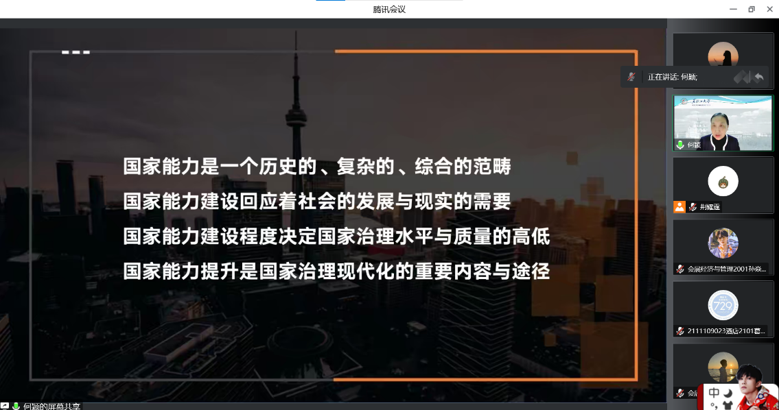第二部分是为国家能力发展规划及现代国家能力建设的内容。何教授通过讲解国家能力发展的基本规律,概况出在构建国家能力过程中的两个方面:一是要构建国家社会治理能力、国家经济调控能力、国家公共服务能力,以此调整国家与社会、国家与市场、国家与公民的关系。二是要构建国家创新能力,以保障国家的可持续发展。何教授详细讲述了国家社会治理能力在社会整合、社会协调、社会秩序维护方面的具体体现;国家经济调控能力在金融市场、市场秩序的作用;国家公共服务能力在公平提供公共物品、尊重与保障公民权利的重要性。随后,何颖教授讲解了国家创新能力如何通过管理、制度、技术的创新从而提高治理变革能力,进而促进现代国家持续发展,并总结了现代国家能力建设的五条路径。