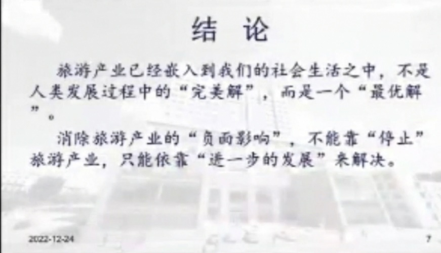 刘海洋老师从文化方面分析认为,,第一,中华璀璨的历史文化可以凝结在景区当中,游客通过浏览参观、景区描述、导游讲解,从而接收与传承历史文化;第二,通过发展旅游产业,促进不同地域间游客的往来,从而了解彼此文化,建立文化认知;第三,通过发展旅游业,带领游客领略中国大好河山,促进游客对了解自己的家乡与文化;第四,发展红色景区,向游客传递“美好生活来之不易”这一价值观念。